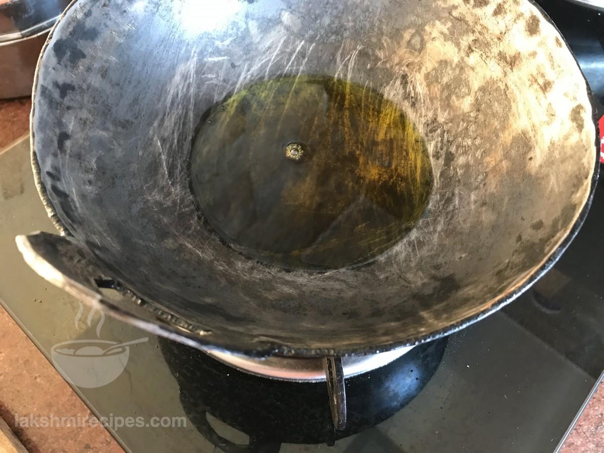- Heat some mustard oil in a kadhai and allow it to become hot enough for frying.