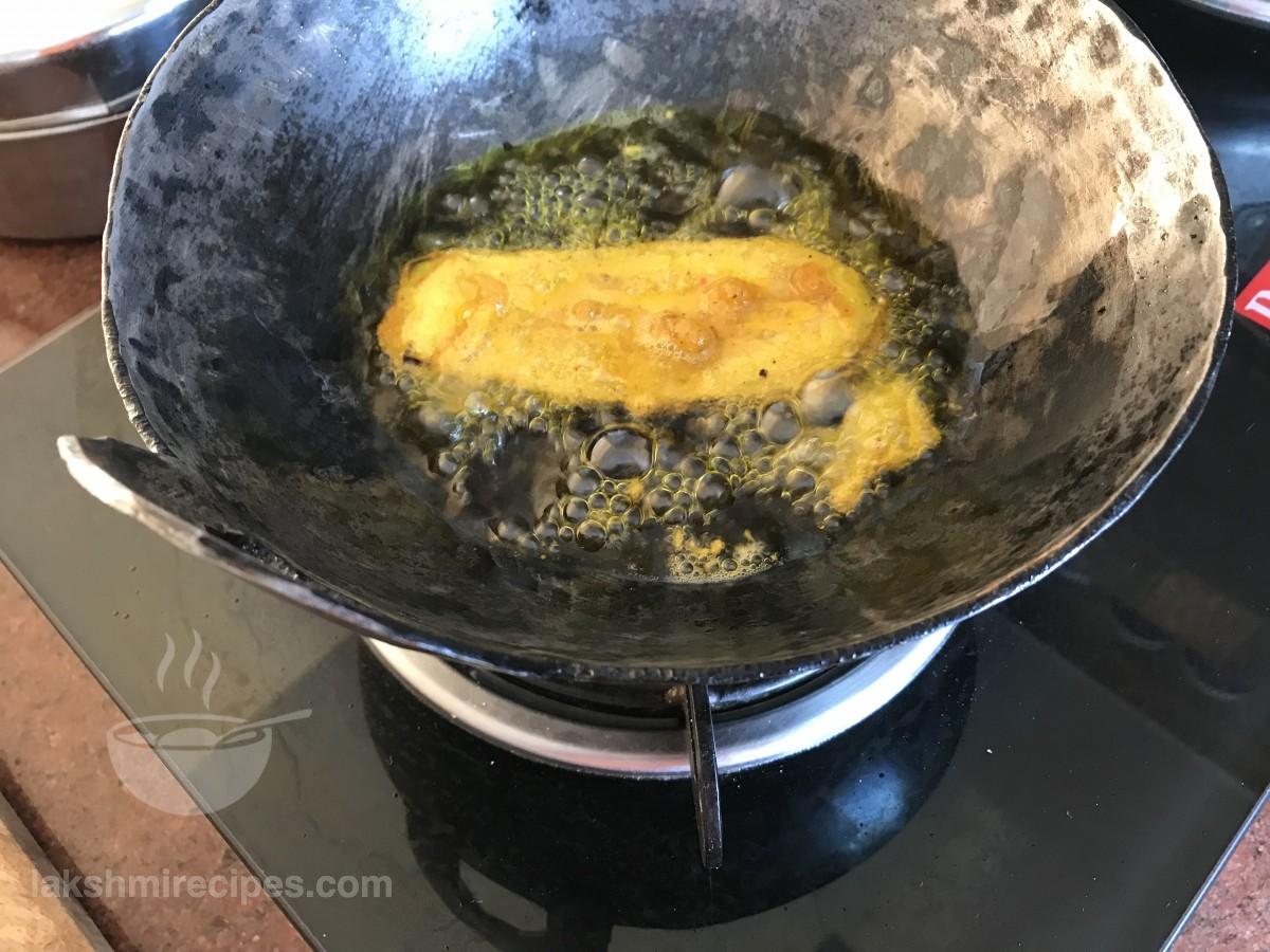 - Now check if the oil is hot enough for frying by putting a drop of batter into the hot oil. If the drop fries and comes to the surface quickly then it means that the oil is hot enough for cooking and you can lower the flame to medium level.