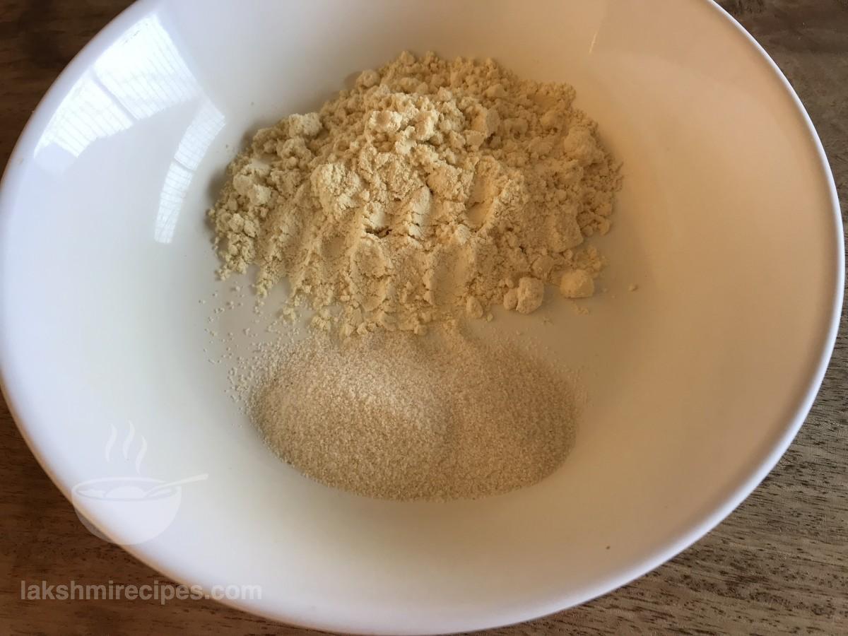 - अब एक और गहरा मिश्रण कटोरा लें और इसमें बेसन और सूजी डालें। दोनों सूखी सामग्री को मिलाएं।