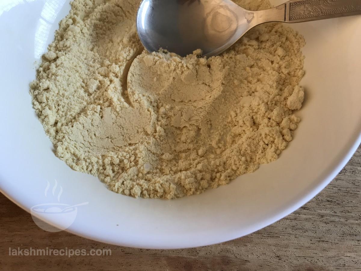 - Now take another deep mixing bowl and add gram flour and semolina to it. Mix the 2 dry ingredients.