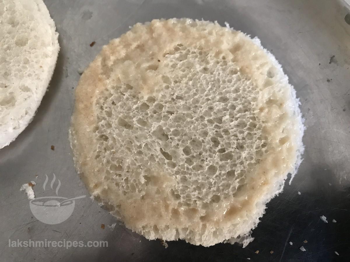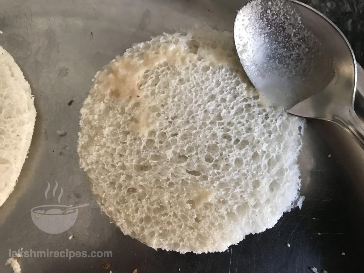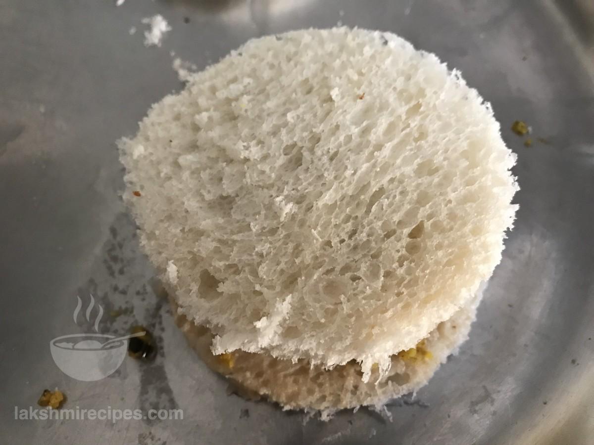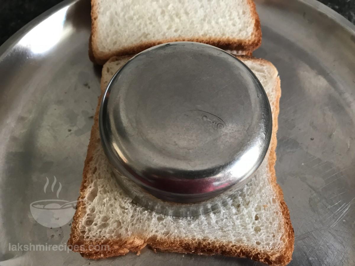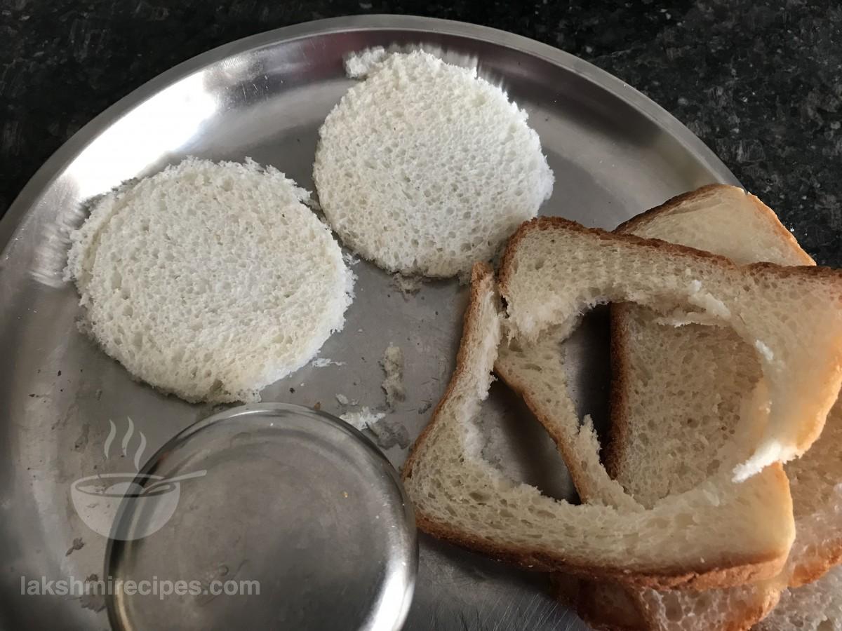 - Now take the bread slices and cut out round pieces from them (as shown in the images below), using a sharp edged bowl or stensil.