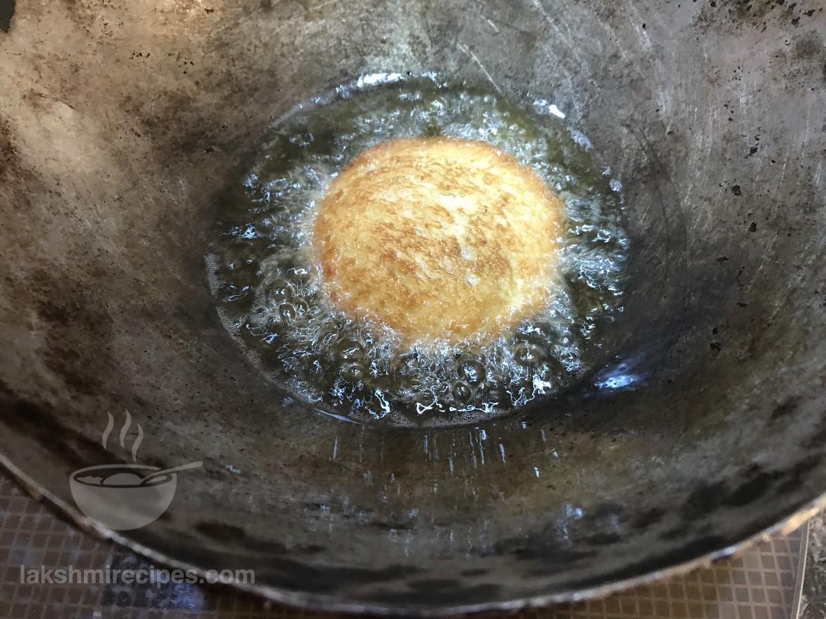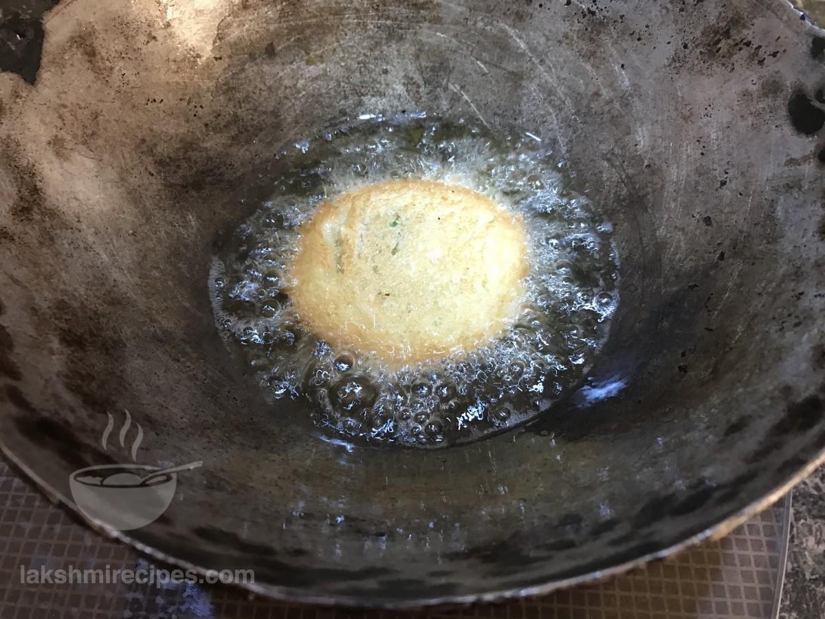 (Tips: Fry the bread kachoris only over high flame, because the bread will absorb less oil when it is fried over high flame.)