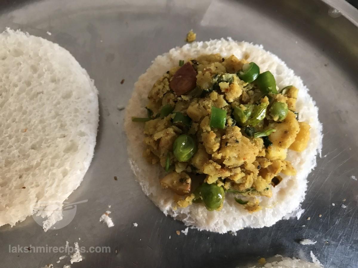 - Then take a spoonful stuffing prepared for bread kachori and place it at the centre of the bread piece.