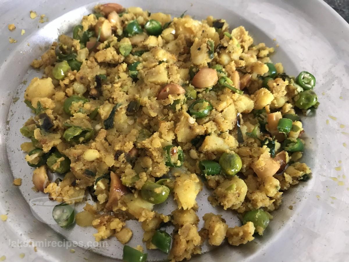 - Now add chopped coriander leaves, fried peanuts, cashews, green peas and raisins to the cooking ingredients. Then mix all the ingredients well.