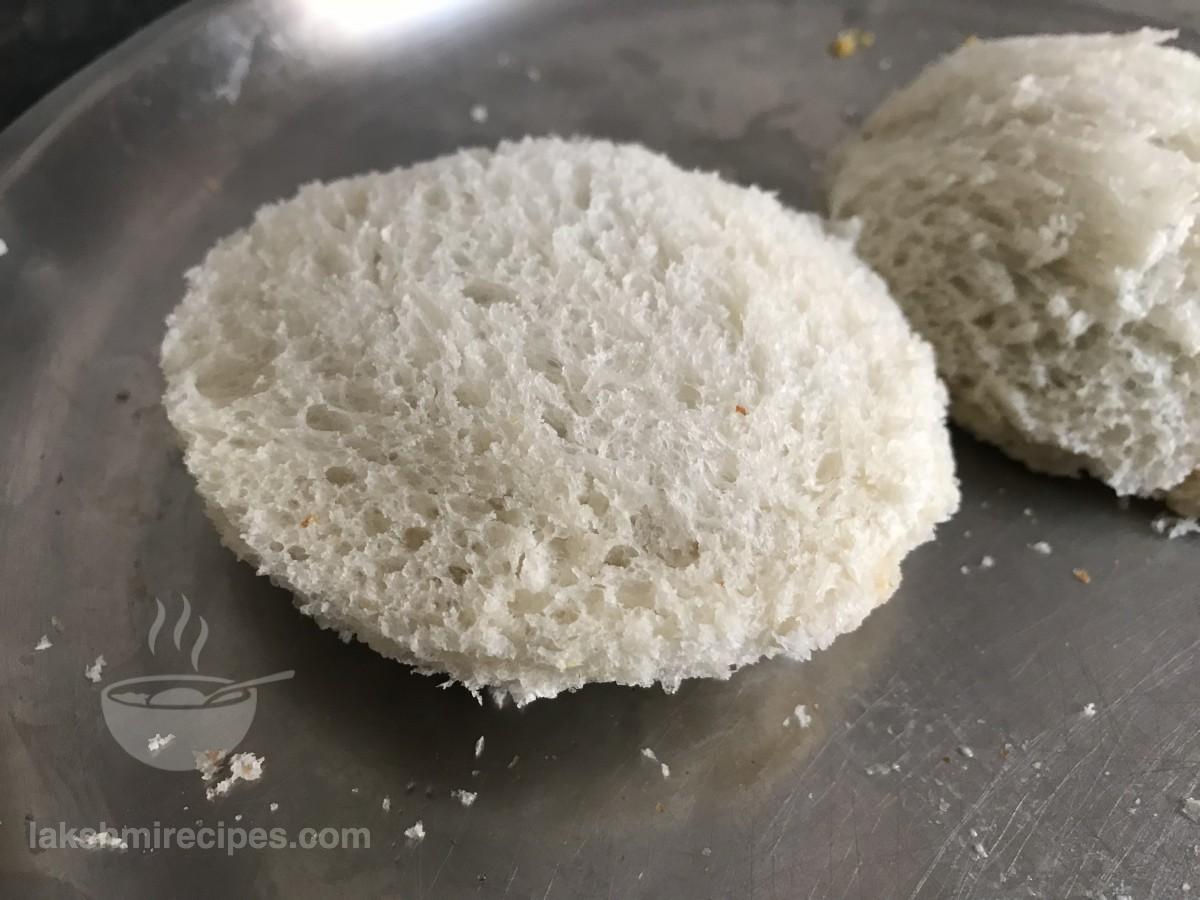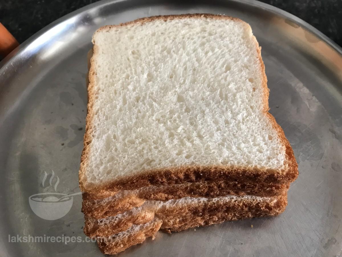 - अब एक ब्रेड लें और उसे तेज धार वाली कटोरी या स्टेंसिल का उपयोग करके, उनको गोल टुकड़ों (नीचे दिए गए चित्रों में दिखाए गए अनुसार) में काट लें।