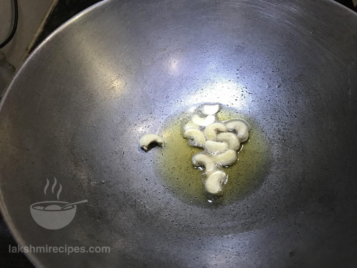 - अब उसी कढ़ाई में काजू डालें और उनको सुनहरा लाल रंग होने तक भूनें। फिर तली हुई काजू को एक थाली में निकाल लें।