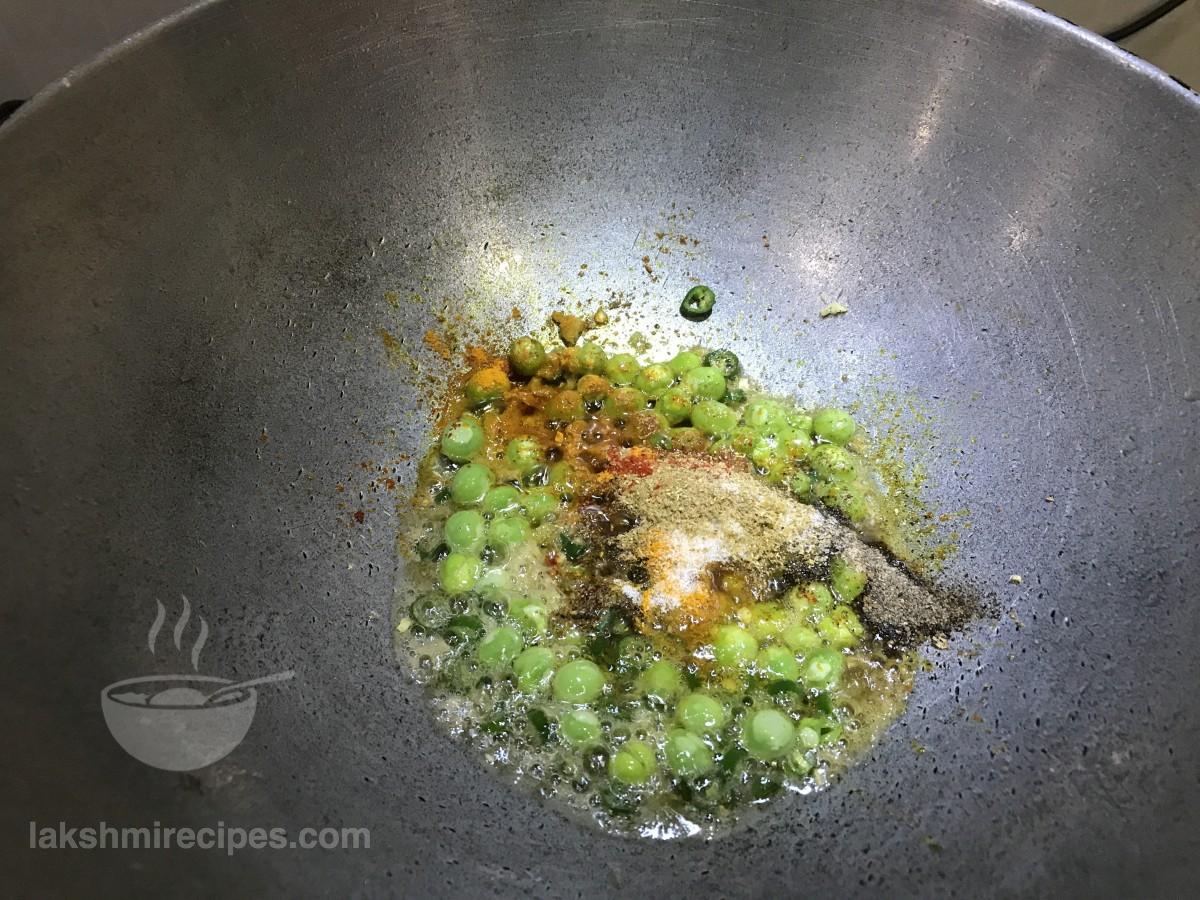 - फिर उसी कढ़ाई में हरी मटर डालें। हरी मटर को कम आँच पर भूनें। फिर भुनी हुई हरी मटर को एक थाली में निकाल लें।