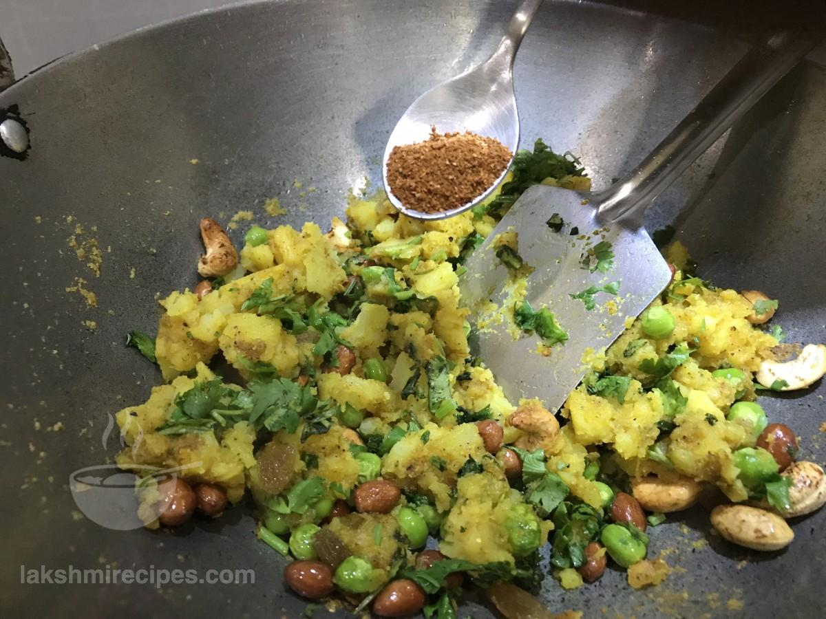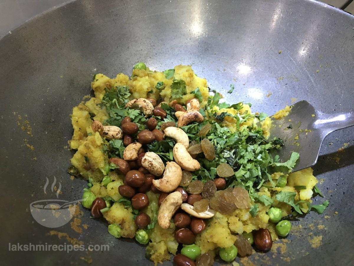 - अब कढ़ाई में कटा हुआ हरा धनिया, तली हुई मूंगफली, काजू, हरी मटर और किशमिश डालें। फिर सभी सामग्री को अच्छी तरह से मिलाएं।