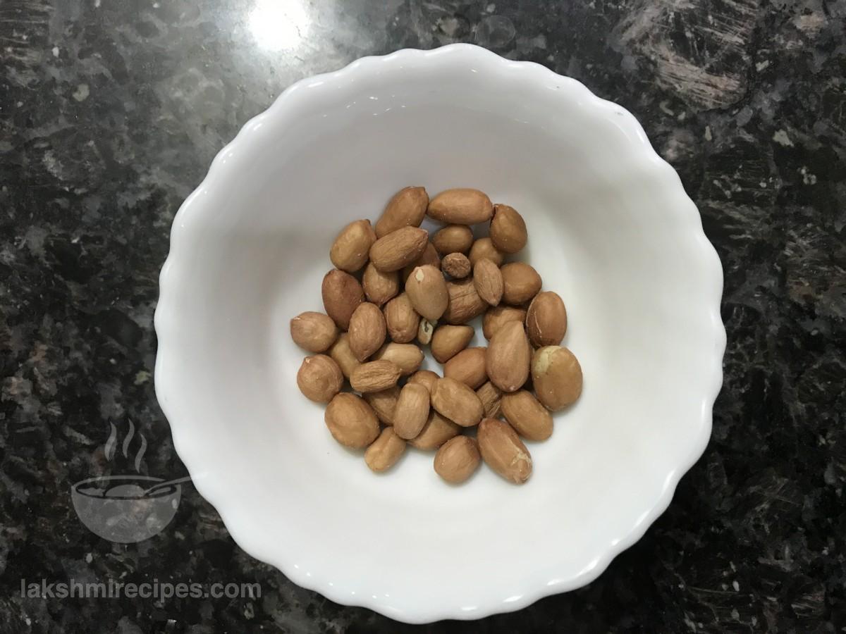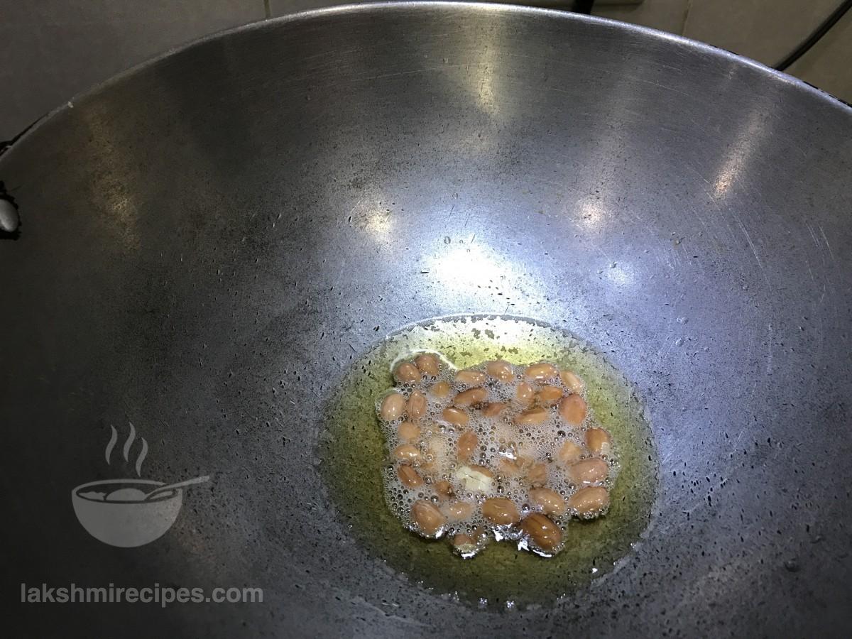 - जब तेल पर्याप्त गरम होजाए तो इसमें मूंगफली डालें और आँच को कम कर दें। मूंगफली को कुरकुरा और लाल होने तक भूनें। फिर तली हुई मूंगफली को एक थाली में निकाल लें।