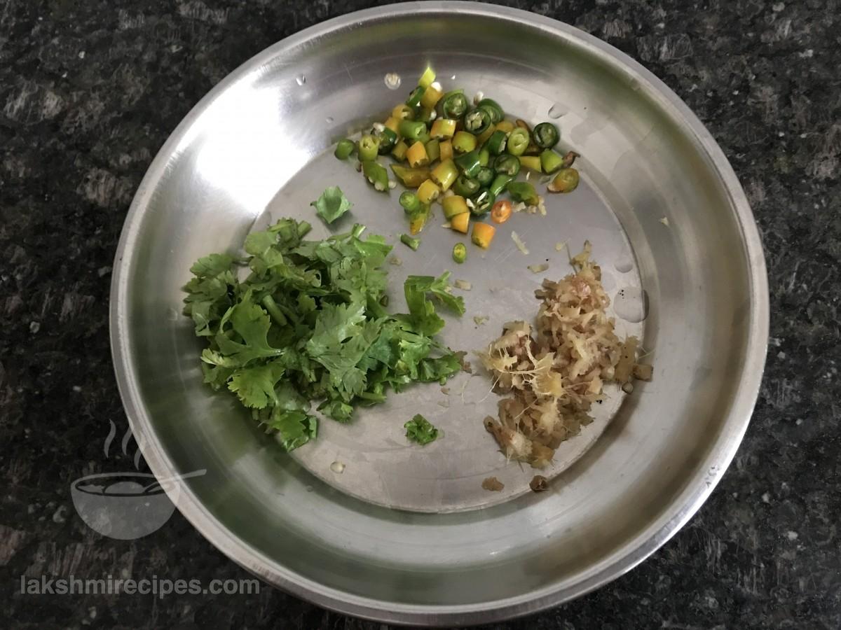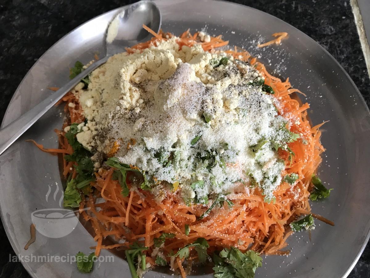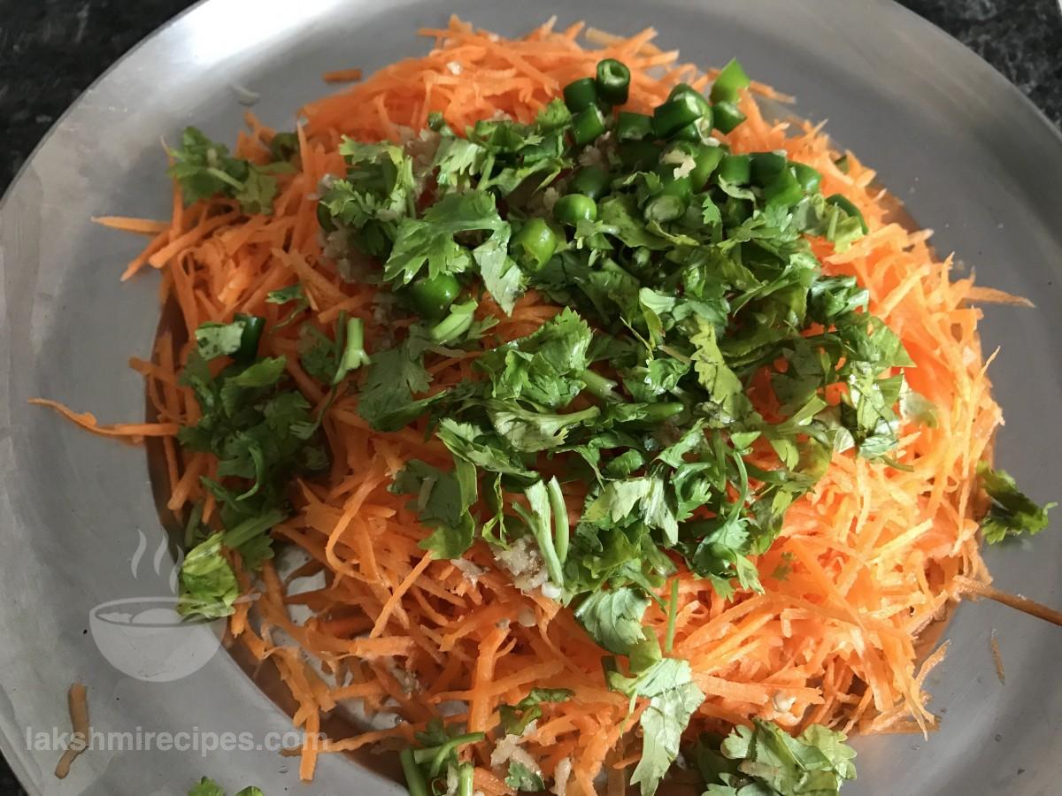 - Now transfer the grated carrot to a big plate and add finely chopped coriander leaves, green chilli and ginger to it. Mix all ingredients well.