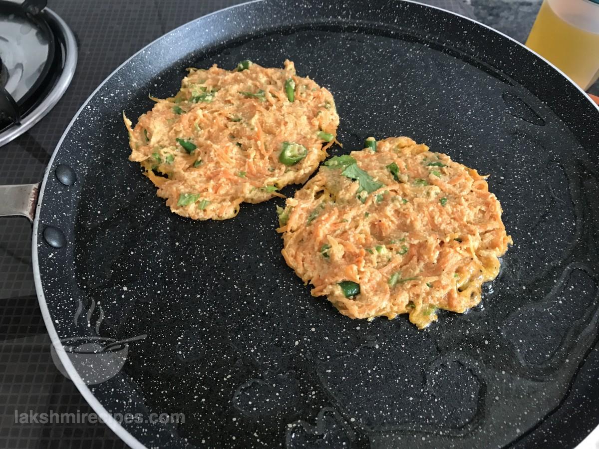 - अब इस कैरट-पैनकेक के मिश्रण को अपने हाथ में लें और इसे नॉन-स्टिक पैन पर डालें। इसे एक गोल आकार में समान रूप से फैलाएं। आँच को मध्यम स्तर तक कम करें और कैरट-पैनकेक के मिश्रण को पकने दें।