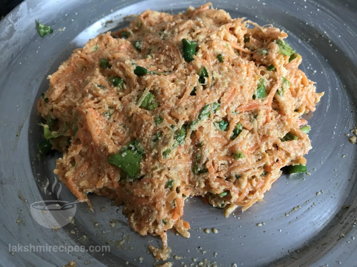 - Generally water is not required to bind the ingredients together. But if the mixture appears very dry then add 1-2 table spoon water and mix well. We do not have to prepare a very thin batter for carrot pancake. The consistency should be enough that the ingredients bind together (as should in the image below).