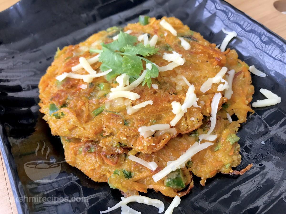 Sweet carrot pancakes are known to everyone and loved when served with rich cream cheese topping. But have you ever tried salty, mildly sweet and spicy and crispy carrot pancakes served with grated cheese topping?