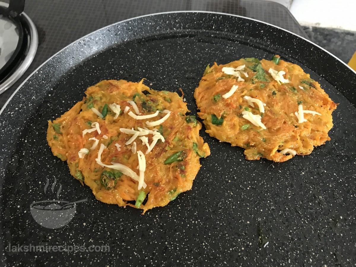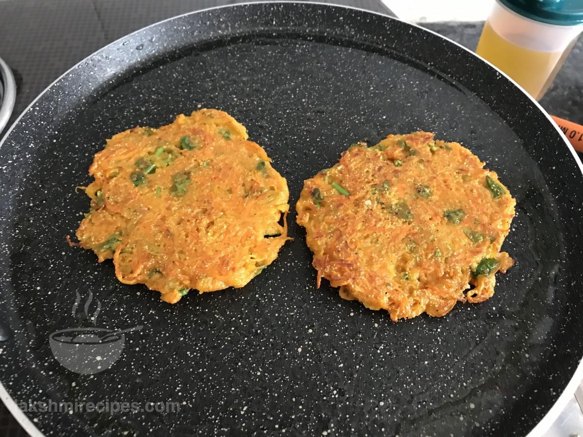 - कैरट-पैनकेक को दूसरी तरफ भी क्रिस्पी लाल होने तक पकने दें, आँच को मध्यम ही रखें।