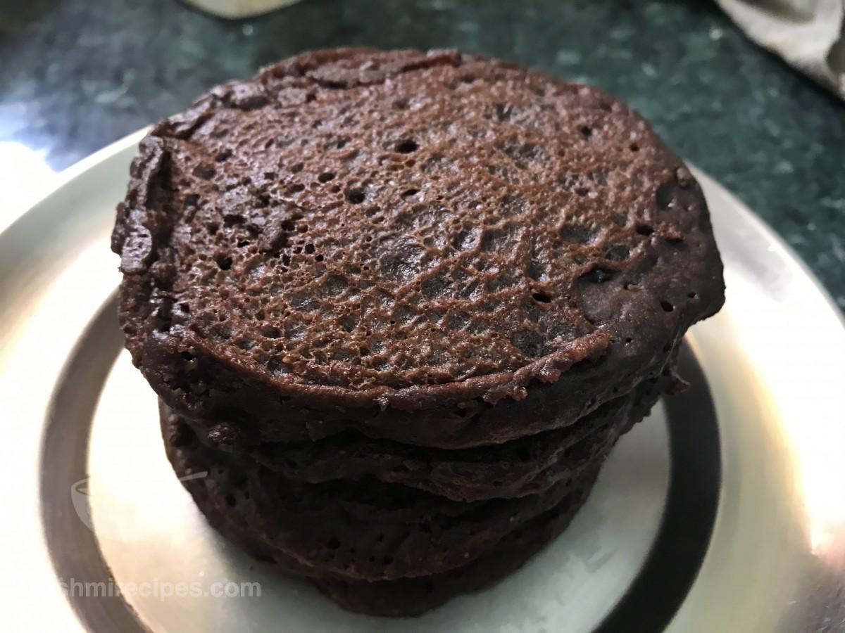 - Now transfer the cooked chocolate pancake to a plate. Prepare chocolate pancakes of the remaining batter in the same manner.