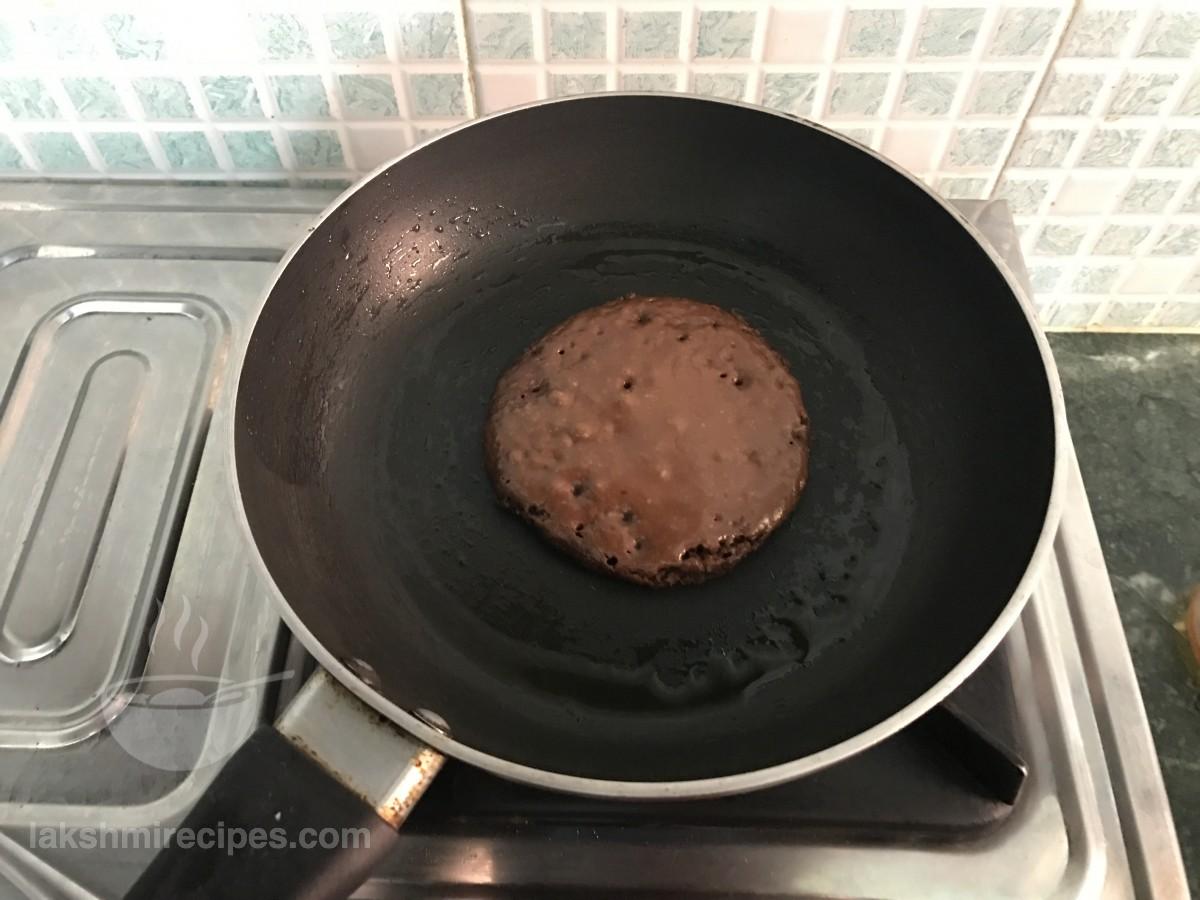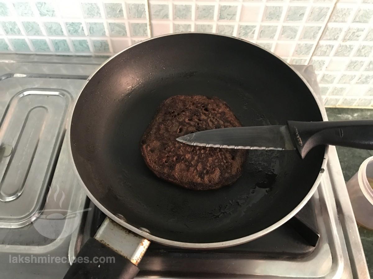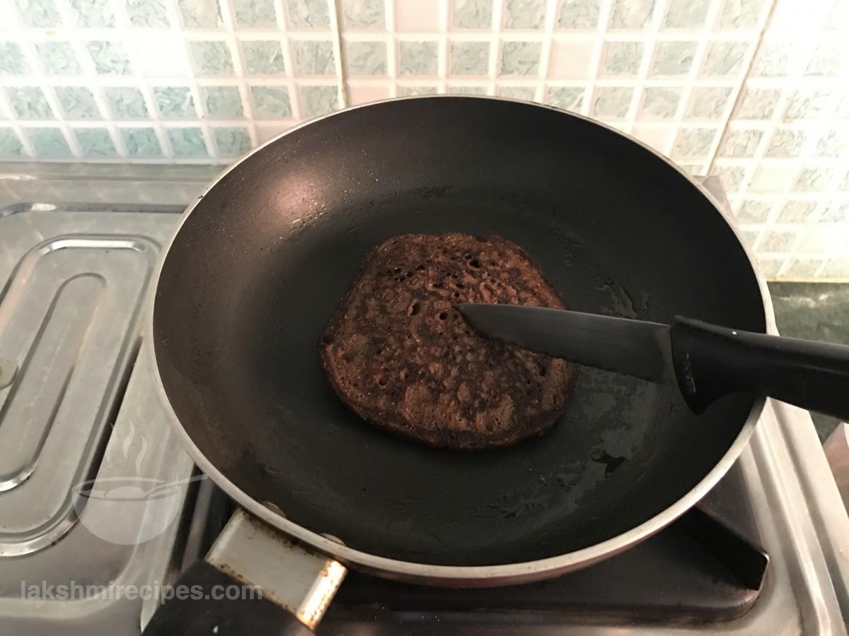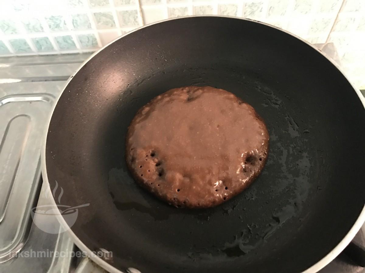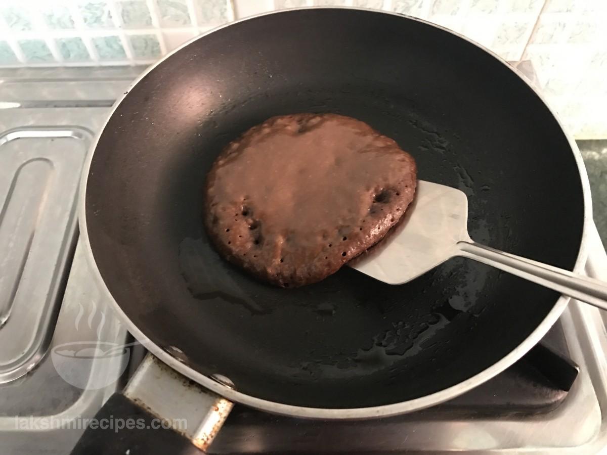 - कुछ और सेकंड बाद चॉकलेट पैनकेक को धीरे से उठाकर पलट दें और इसी तरह से दूसरे पक्ष पर पकने दें।