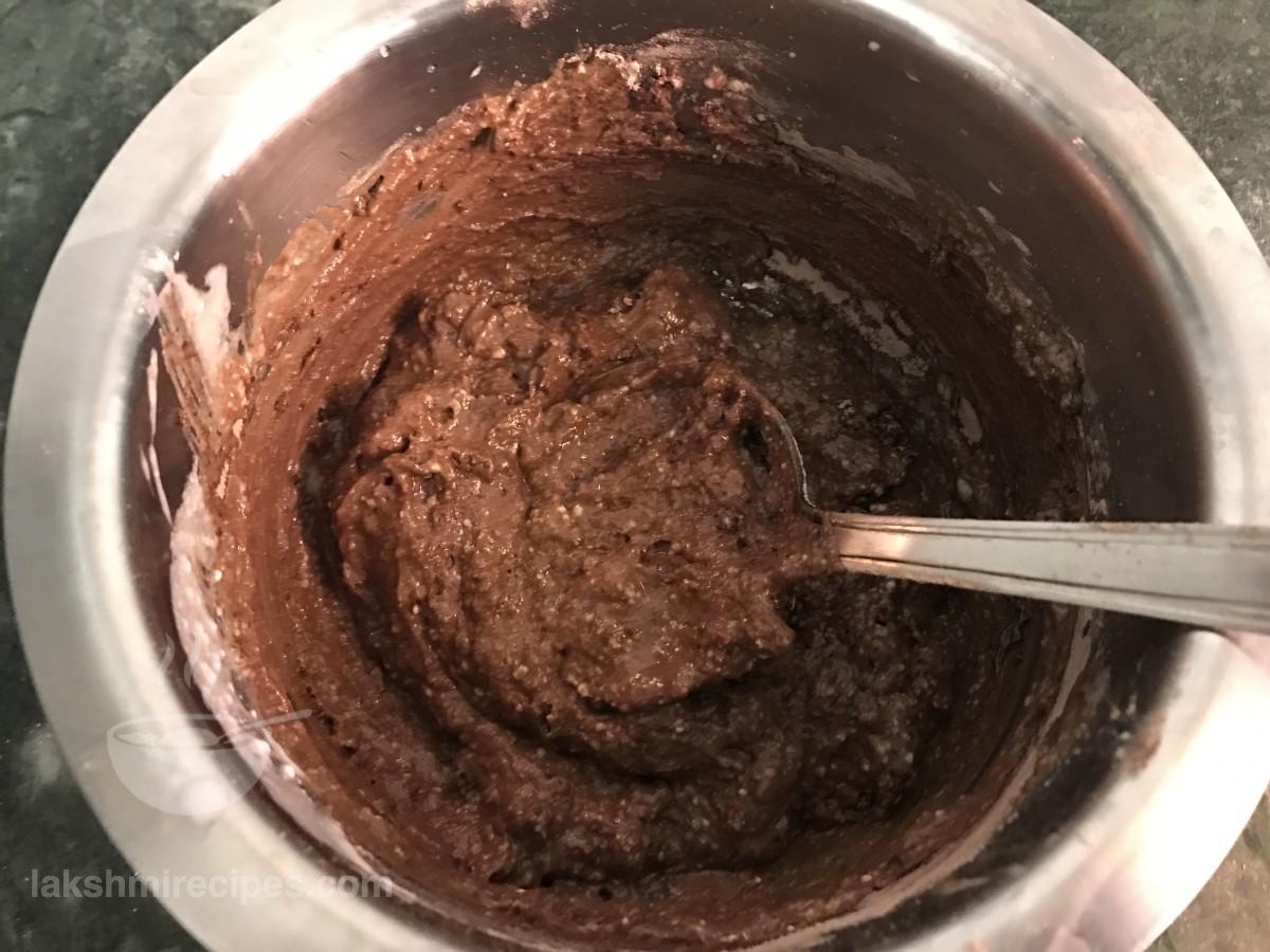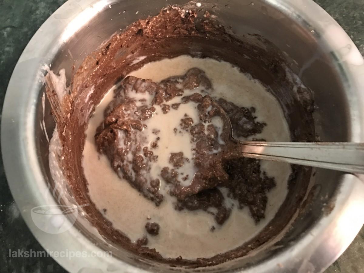 - Then add the remaining dry mixture and mix well to form the chocolate pancake batter. If the batter appears thick then add milk as per your requirement to form a batter of medium thin consistency. The mixture should be flowy enough so that it spreads on its own on pouring over the hot non-stick pan, like uttapam.