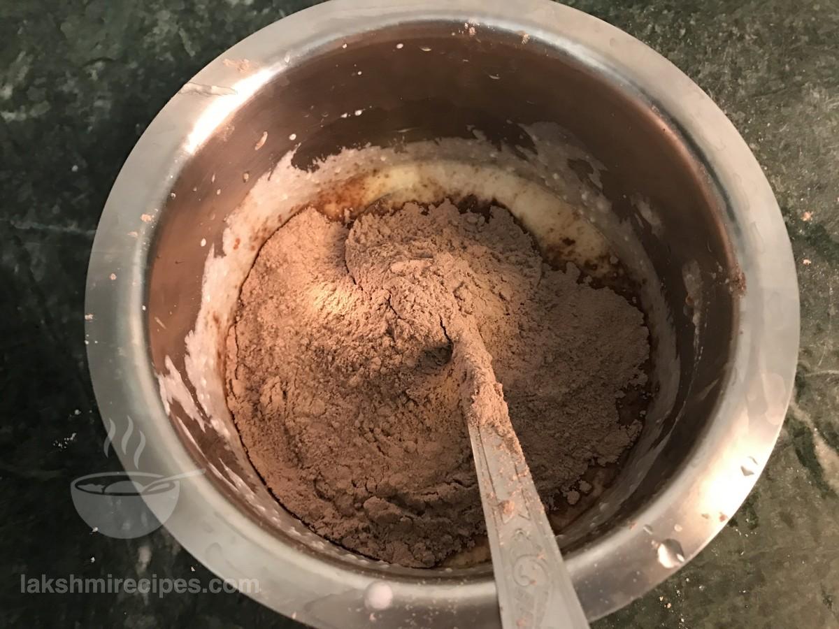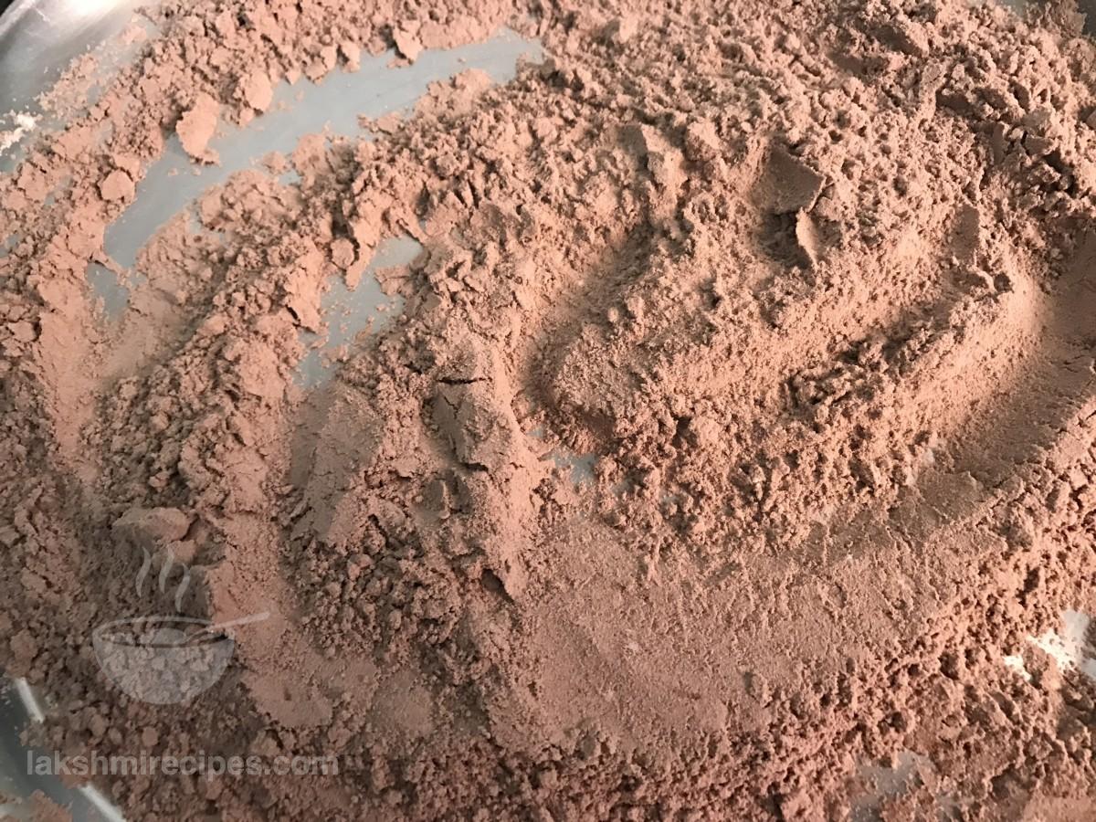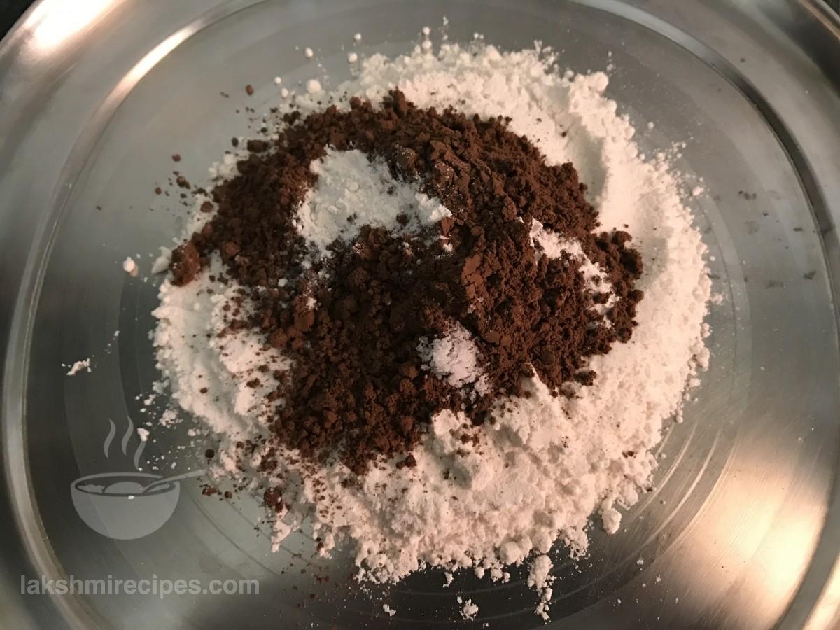 - Take all purpose flour or maida, cocoa powder, baking powder, baking soda and salt together in a plate. Mix the ingredients together with your hands nicely.