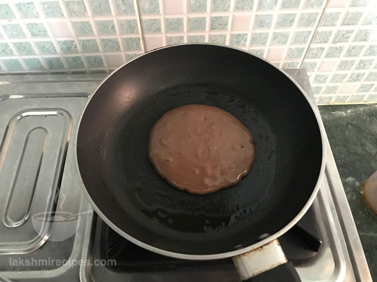 - फिर एक गोल कल्छी लें और गरम नॉन-स्टिक पैन पर 1 कल्छी भरकर चॉकलेट पैनकेक का बैटर डालें। चॉकलेट पैनकेक का बैटर अपने आप पैन पर फैल जाएगा।