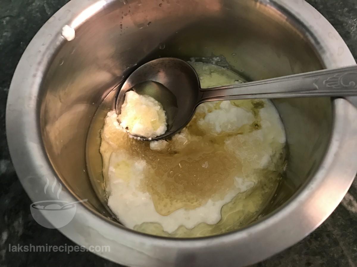 - Now take curd, sugar and 1/4 cup refined oil in a deep vessel. Whisk to mix the ingredients well together until the sugar dissolves well.