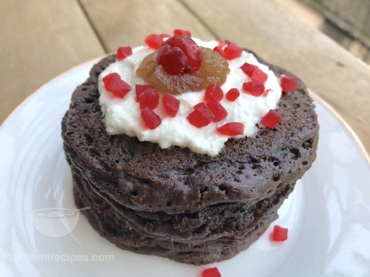 - Garnish these chocolate pancakes with honey or cream or chocolate sauce or hung curd and cherries. The tempting and tasty chocolate pancakes are ready to be served.