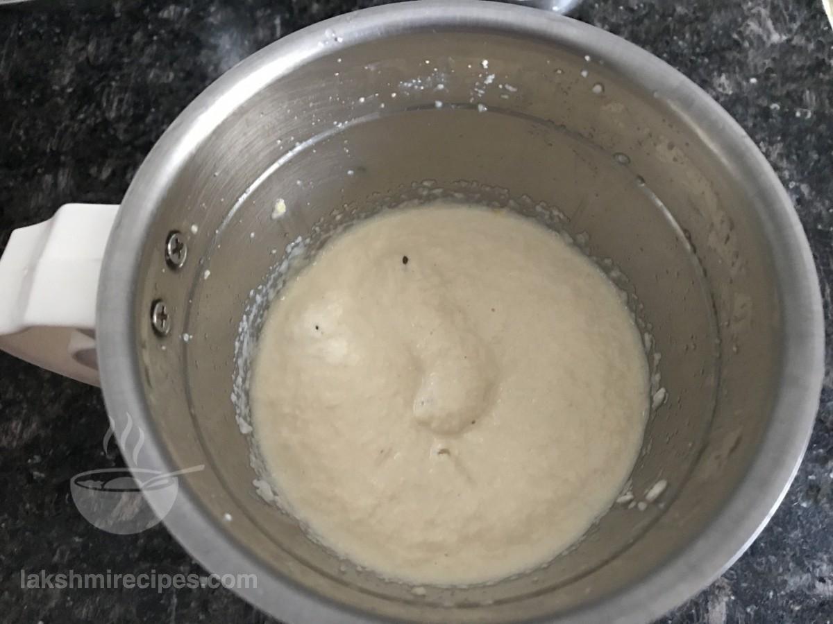 - 4 घंटे के बाद भीगे हुए चावल और दालों को मिक्सर जार में डालें और बारीक बैटर के रूप में पीस लें। यदि आवश्यकता हो तो पीसते समय, मिक्सर जार में 2-3 बड़ा चम्मच पानी डाल लें।