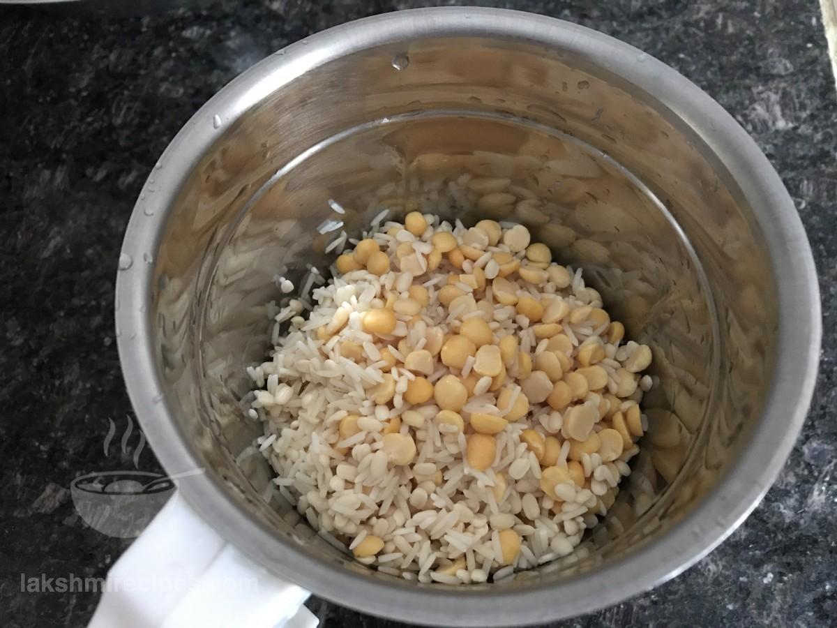 - Rinse the Bengal Gram and Splitted Black Gram also with clean water and transfer them to the same vessel in which the rice is kept.