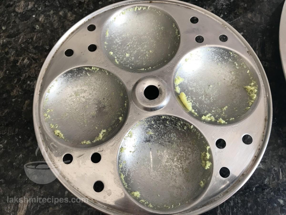 - Grease the idli stand with some refined oil or ghee and then pour the Dhokla Idli batter into it with the help of a spoon.