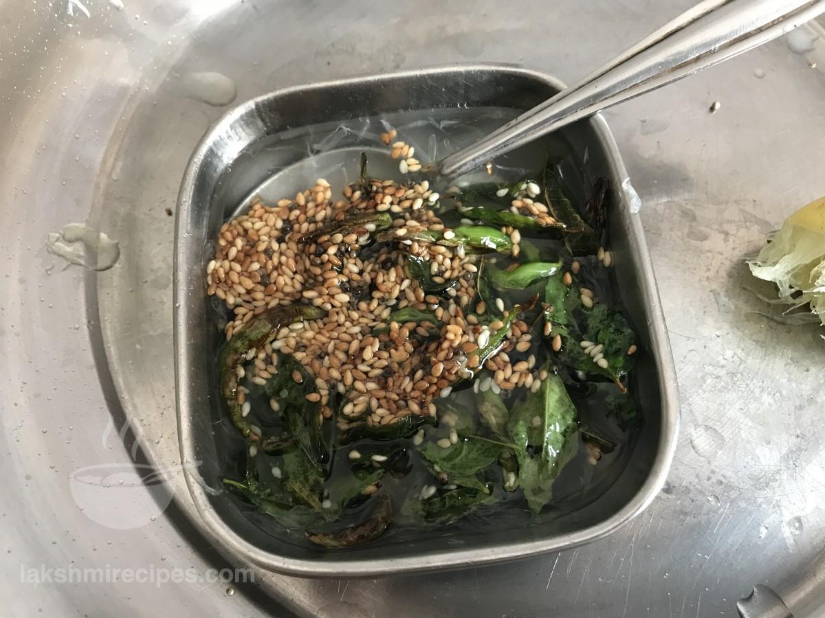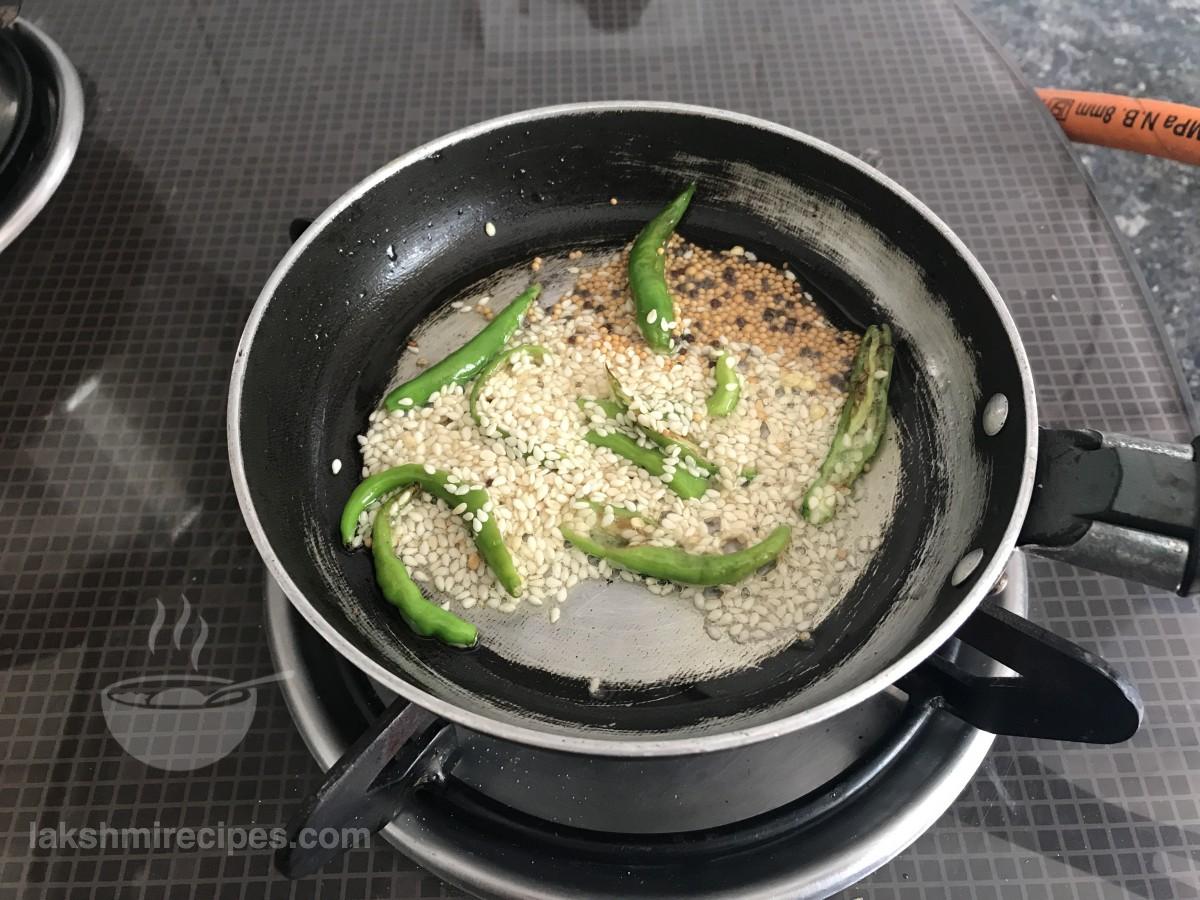 - तिल और राई को चटकने दें और फिर इसमें कटी हुई हरी मिर्च और करी पत्ता डालें। इस सामग्री को हल्का सा भूनें।