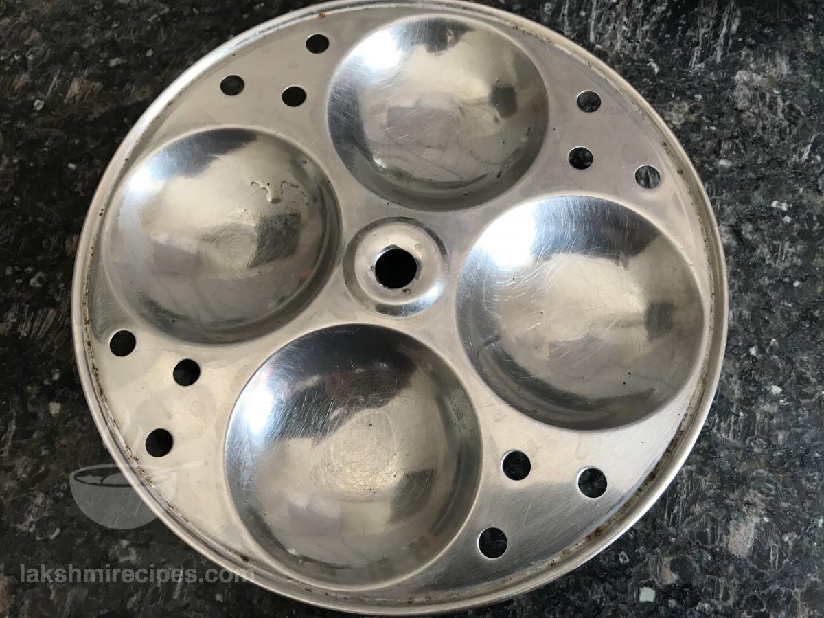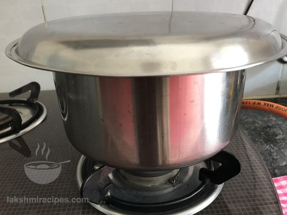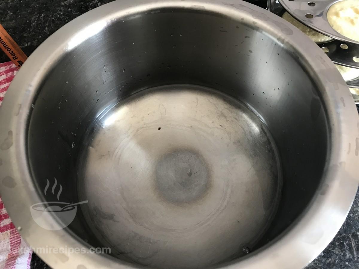 - Take a deep vessel with some water in it. Place the idli stand in this vessel. (Remember, the level of water in the vessel should be lower than the base of the idli stand.)