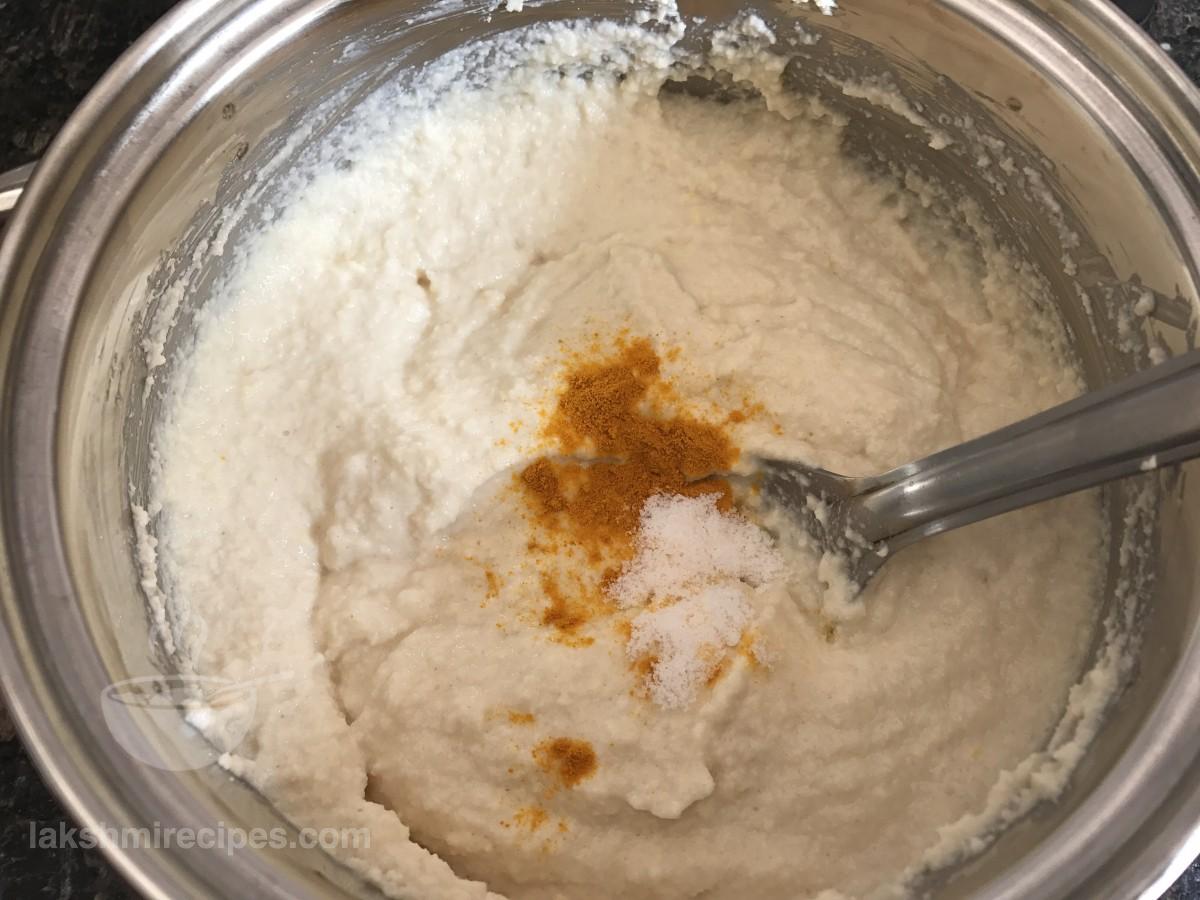 - Stir and mix the fermented batter with a spoon and then add turmeric powder and salt to it.