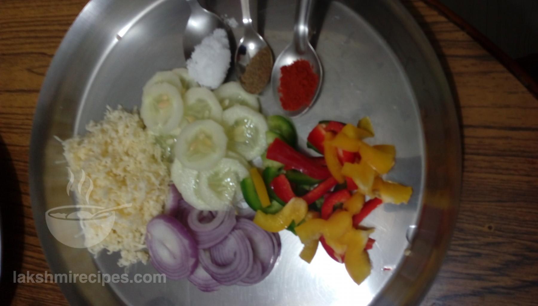 - After this put a round cut slice of onion (pyaz) and cucumber (kheera) on it.