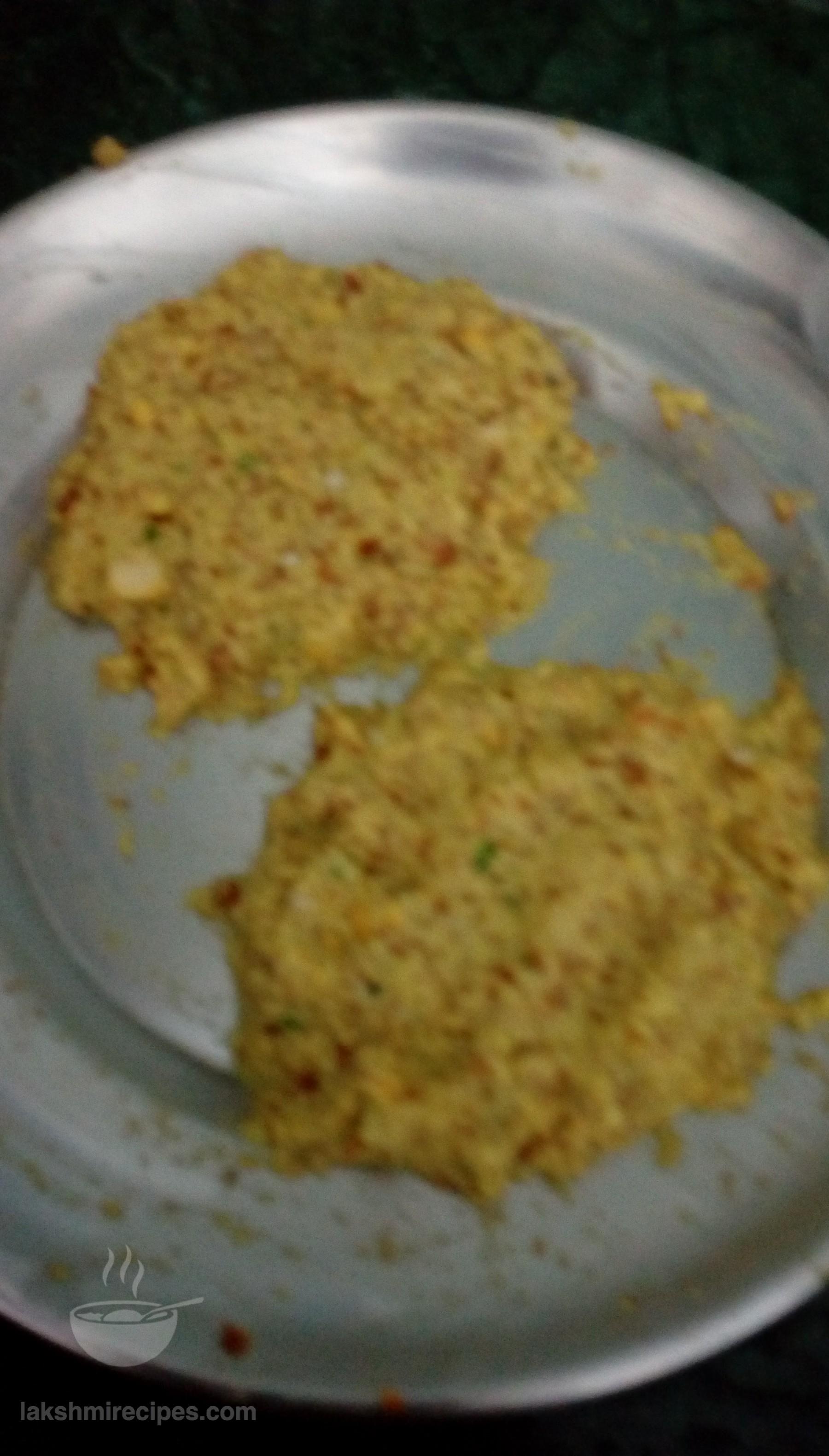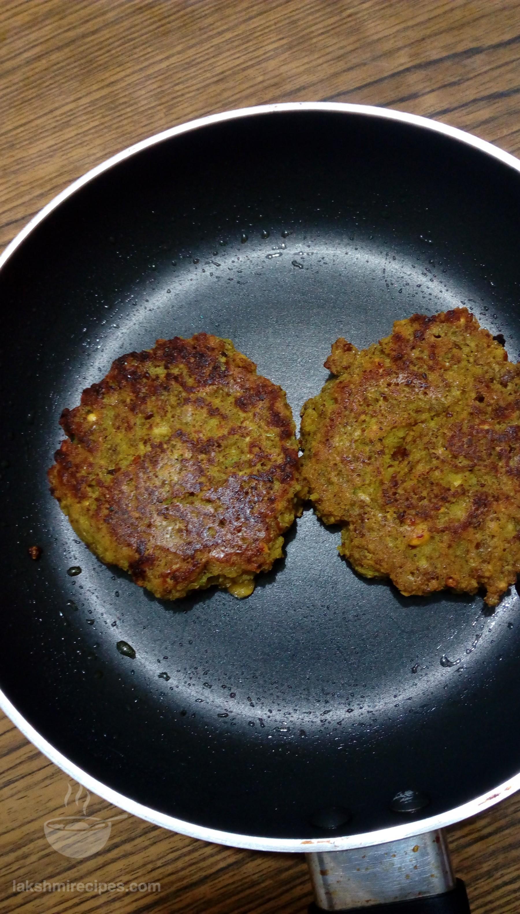 - Then prepare two falafel patties (tikkis) of the chana mixture prepared in the previous step (The diameter of the tikkis should be same as that of the burger buns). Now put these falafel patties (tikkis) on the tawa to cook them till they turn crispy golden red on the base side. Flip and cook the falafel patties (tikkis) on the other side in the similar manner. (Cook the tikkis over low flame only)
