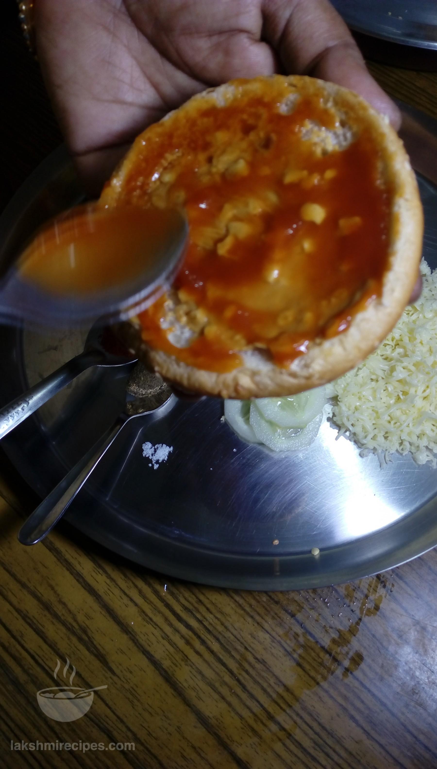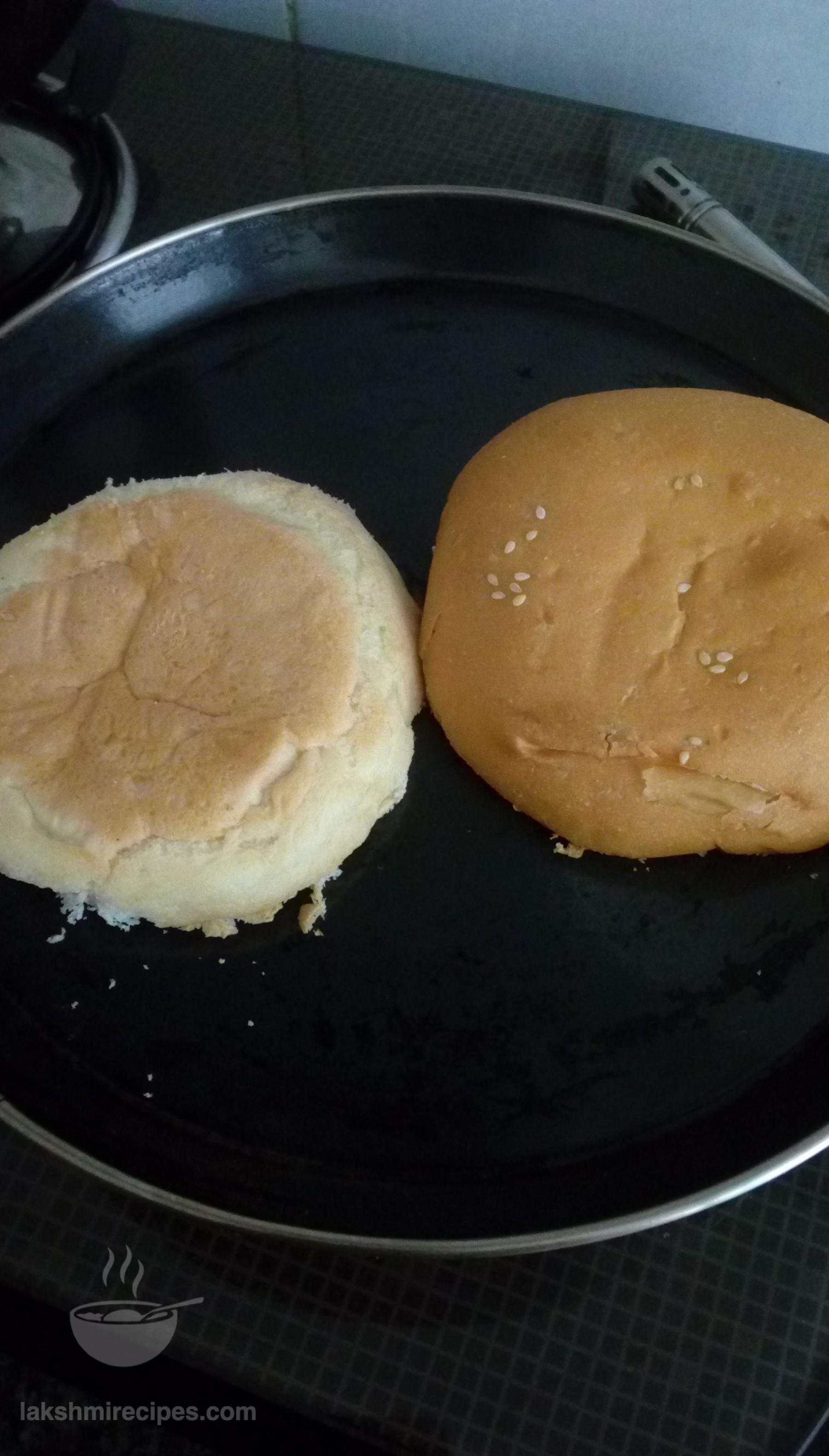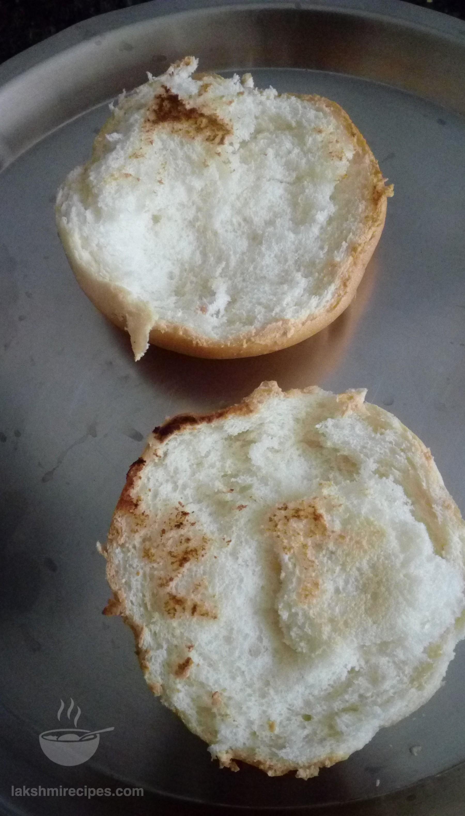 - Then toast the buns with some butter on a tawa on the inner side of each of the halves (as shown in the image below).