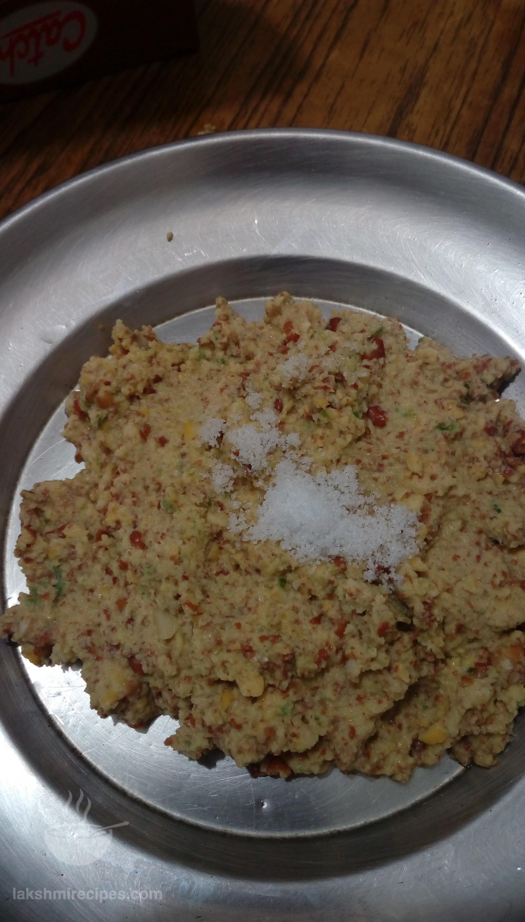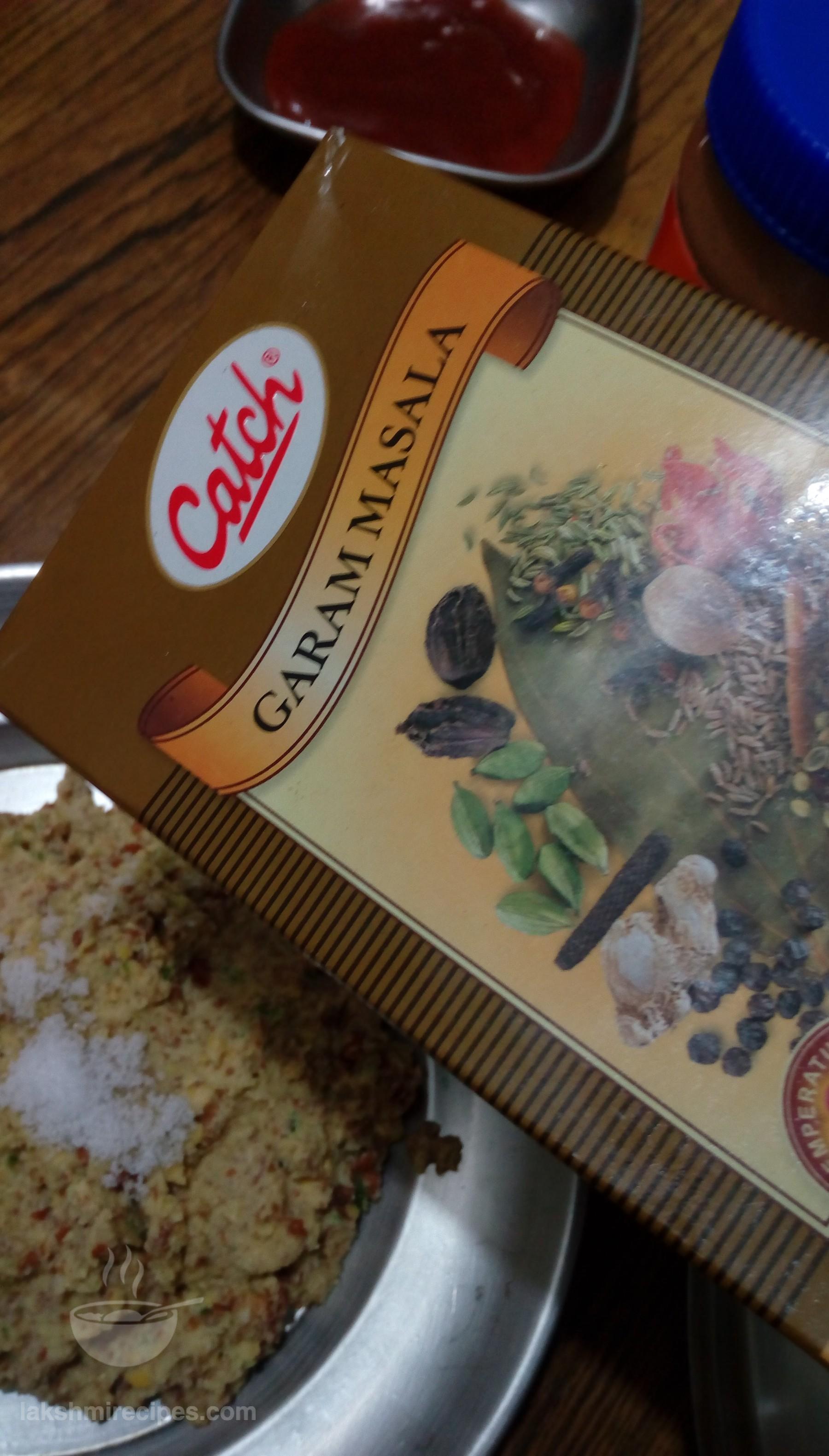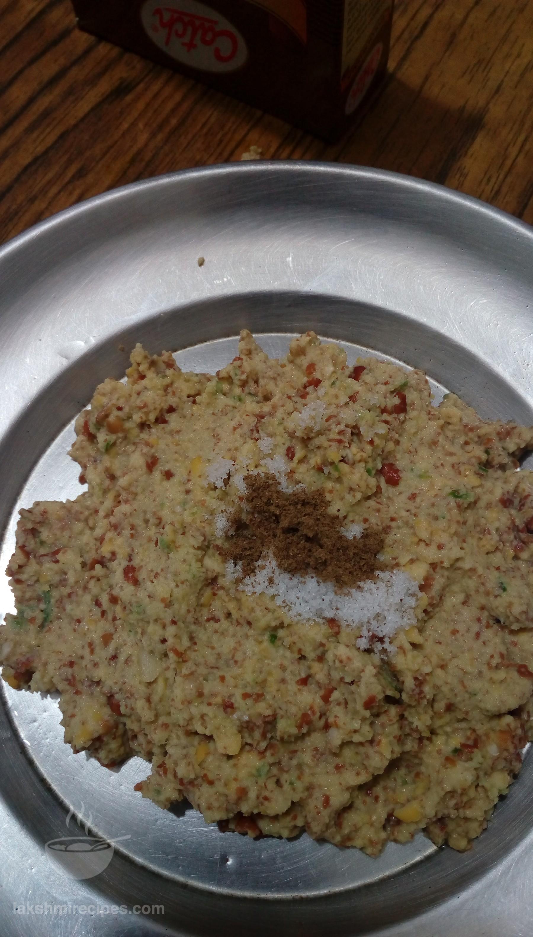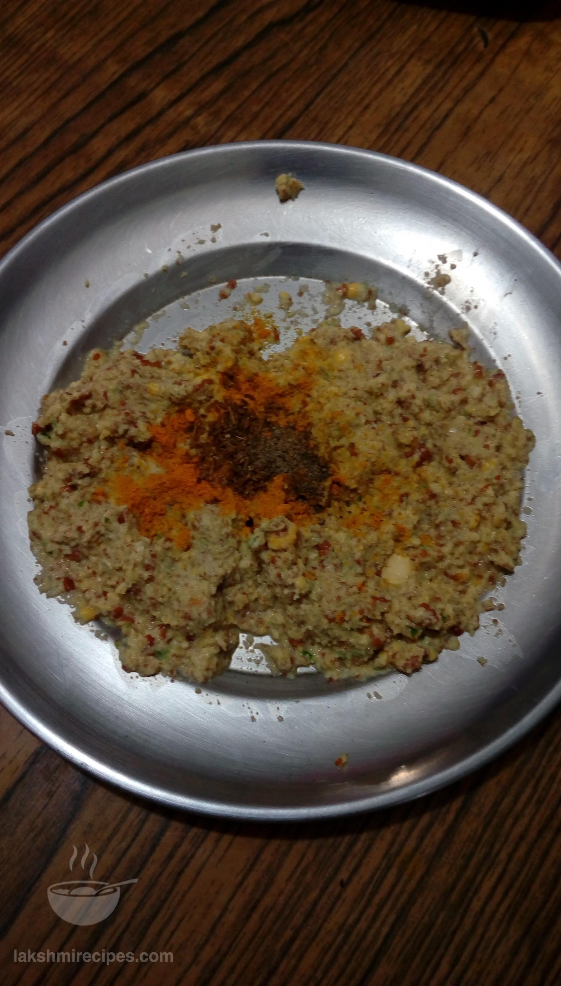 - Transfer the grinded ingredients to a mixing bowl and add salt, turmeric powder (haldi powder) and garam masala powder to it and mix well.