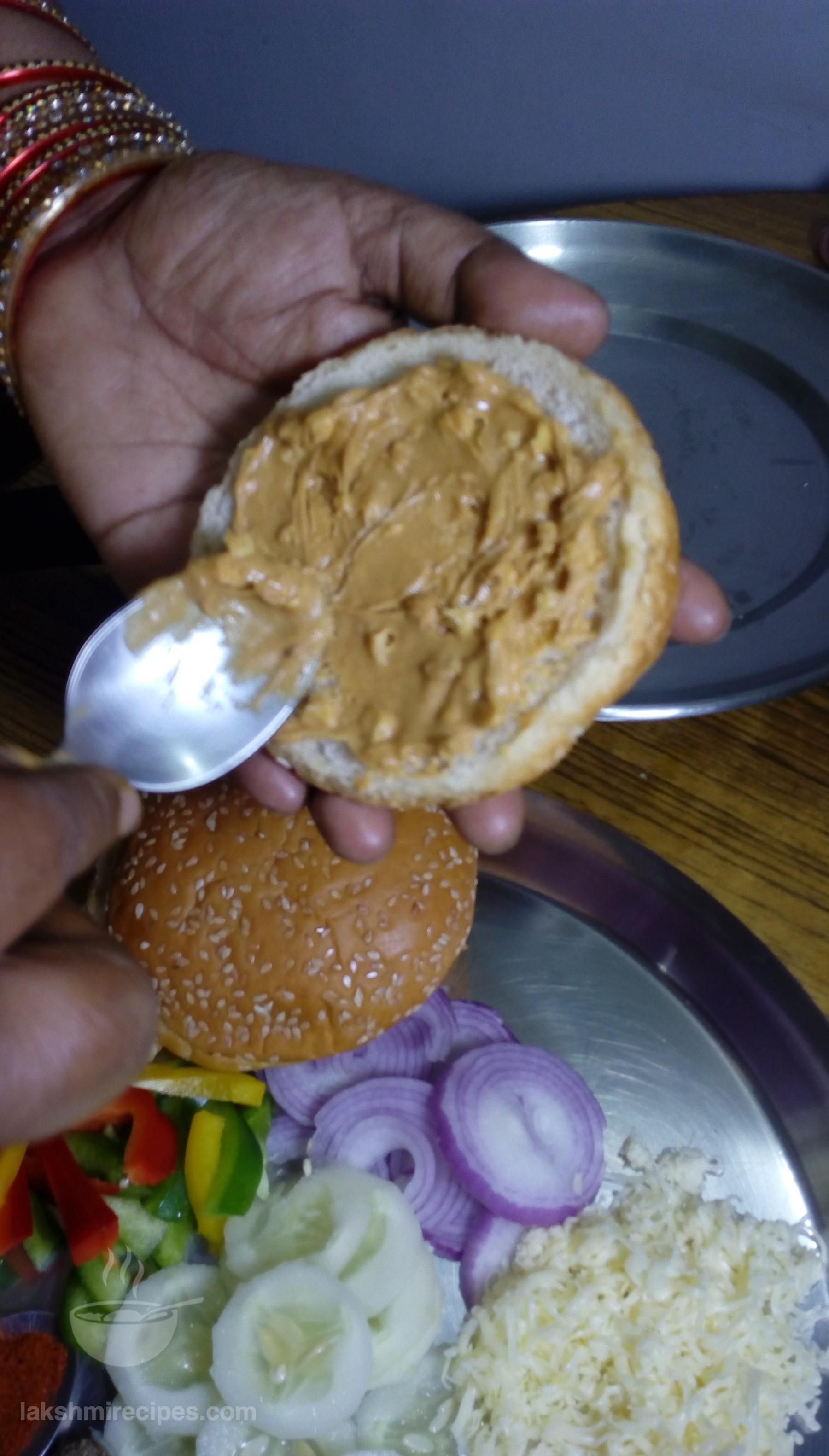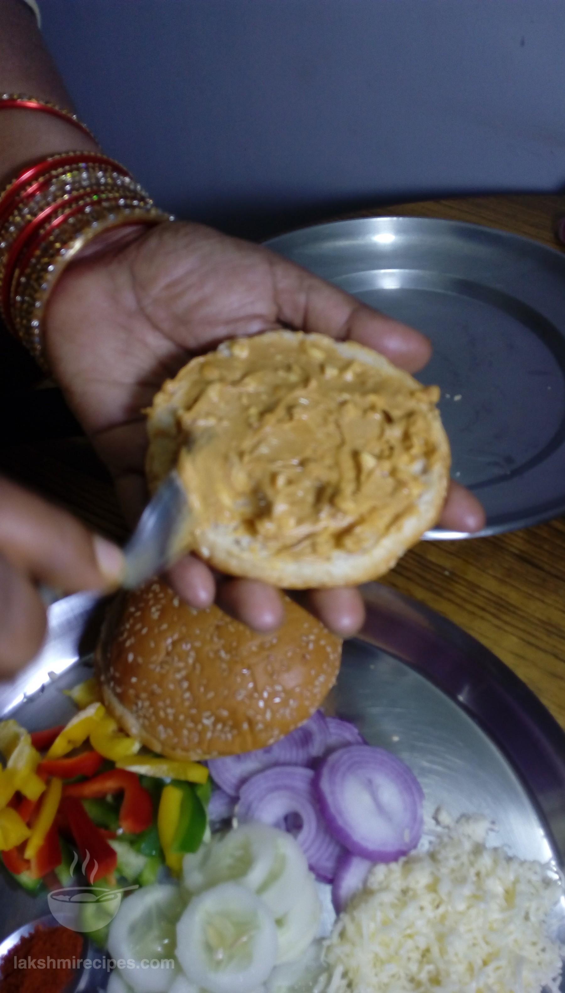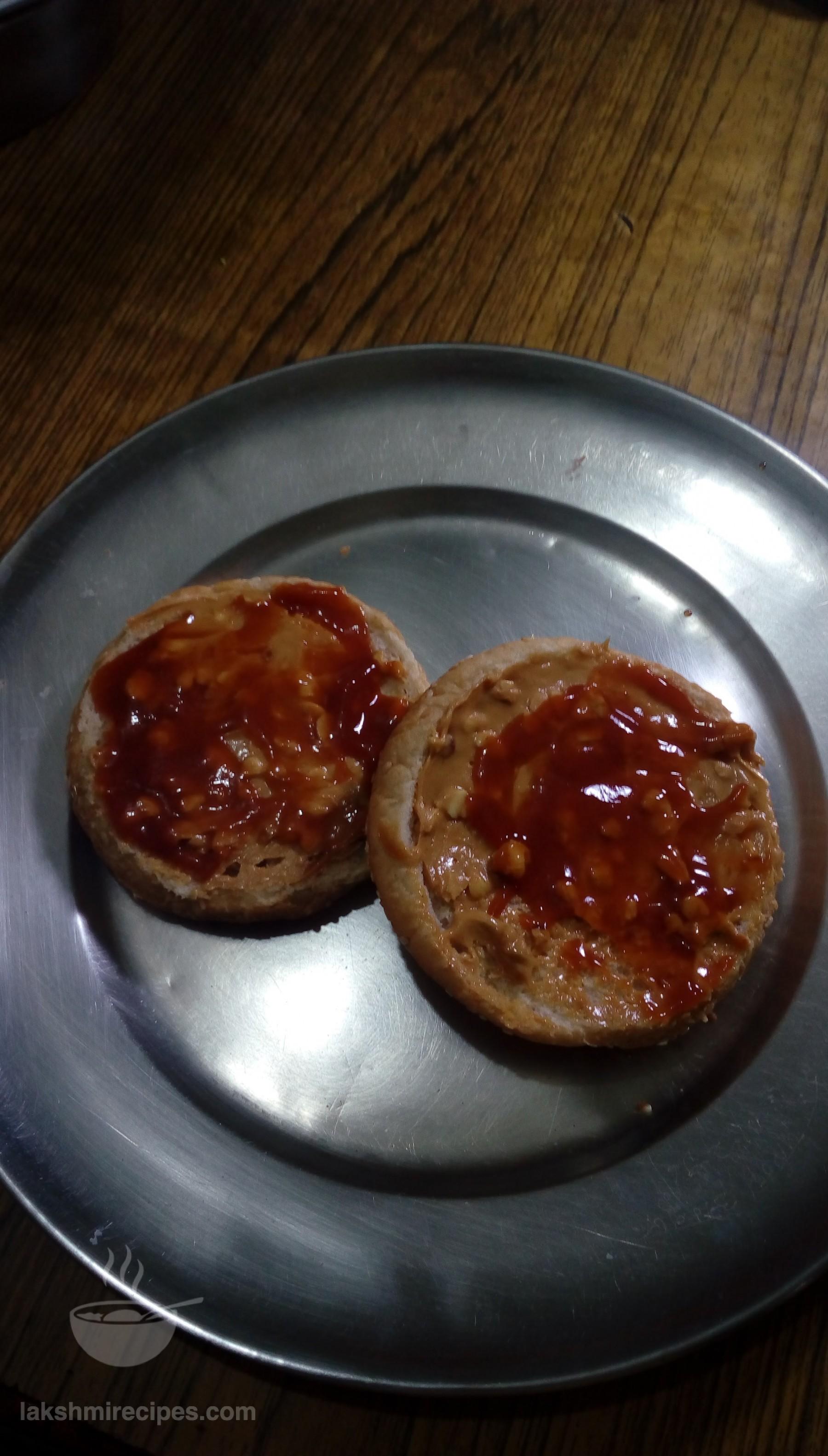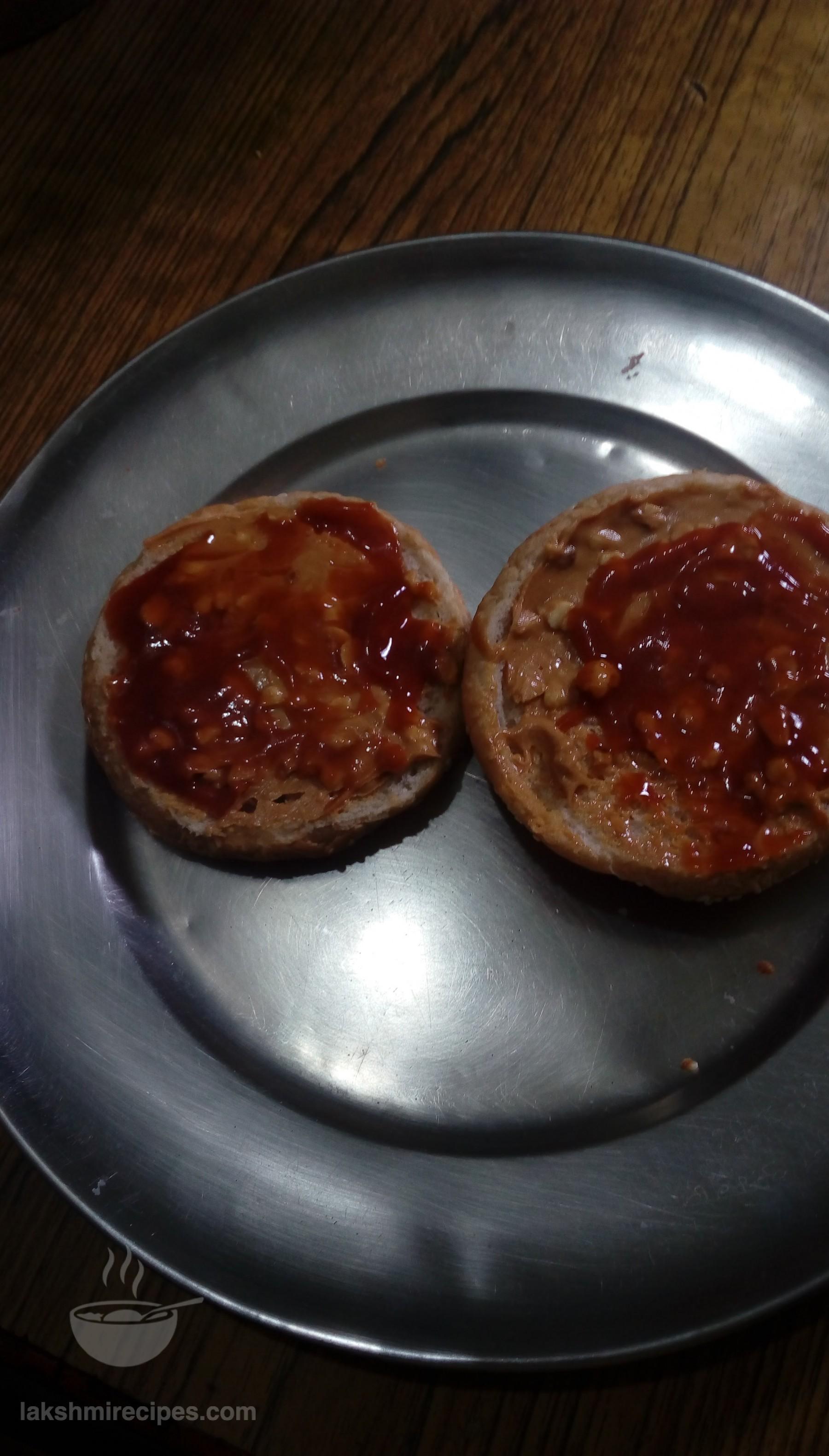 - Now spread some peanut butter on the toasted side of the lower half of the burger bun followed by a layer of tomato sauce.