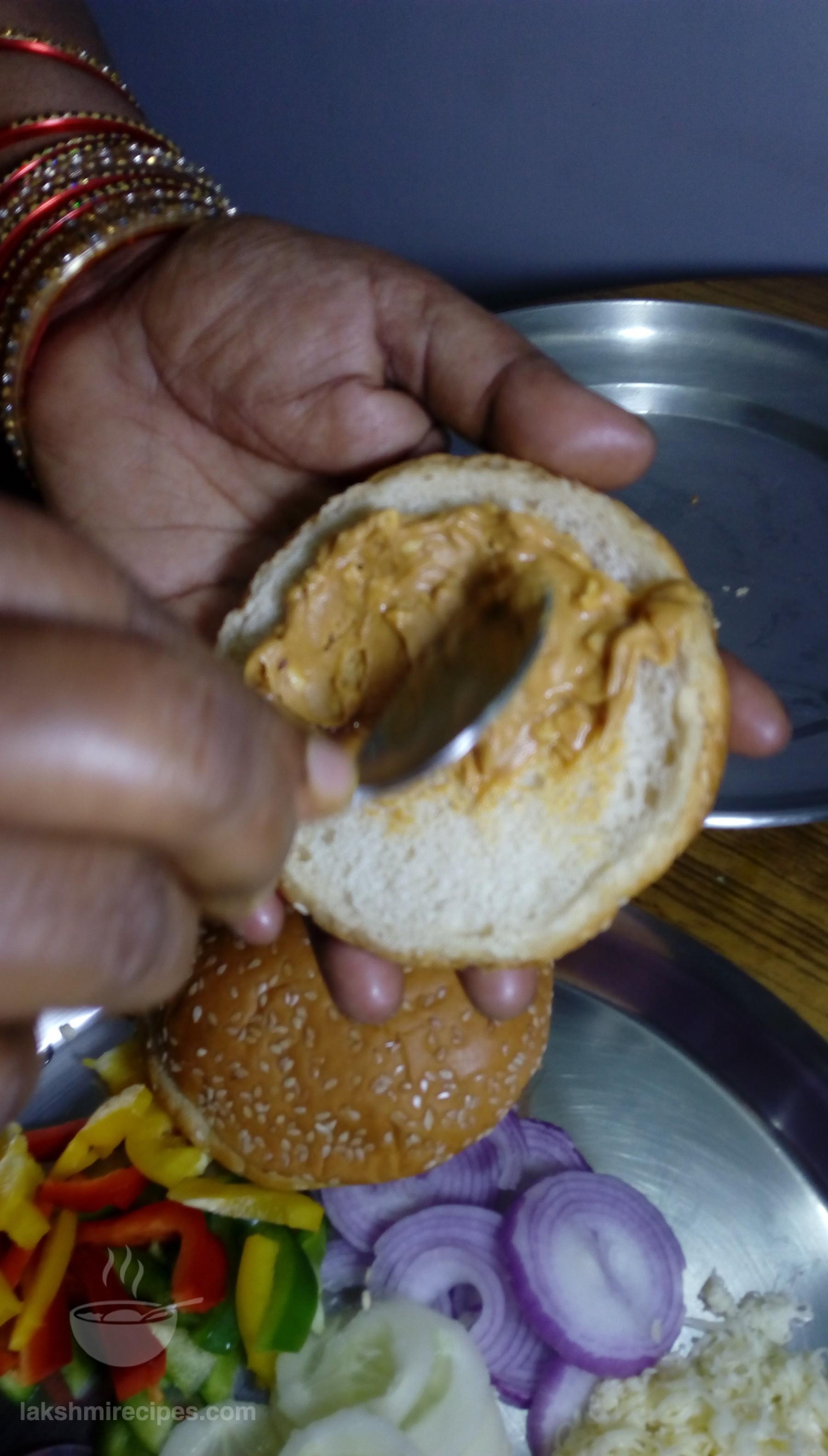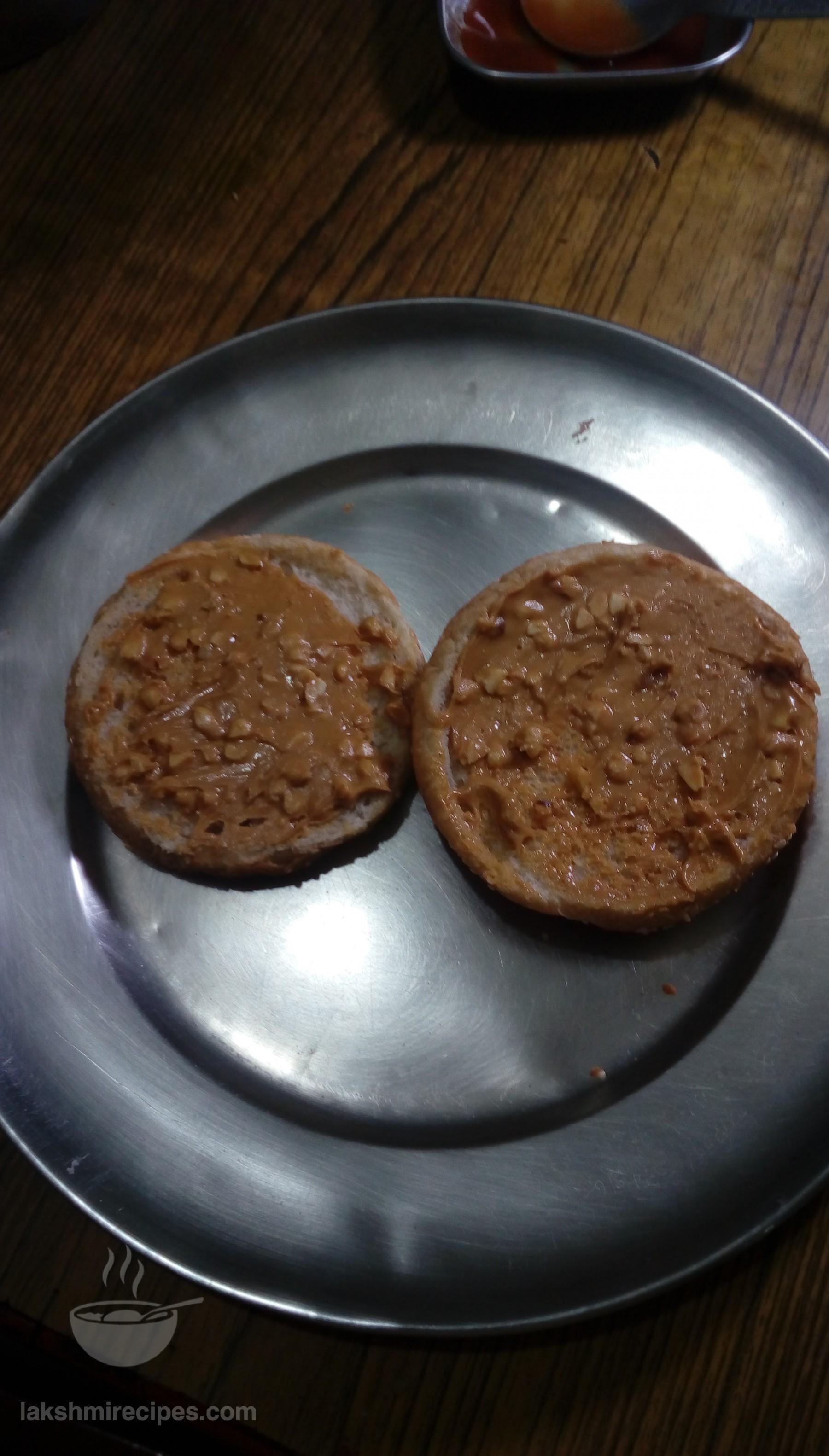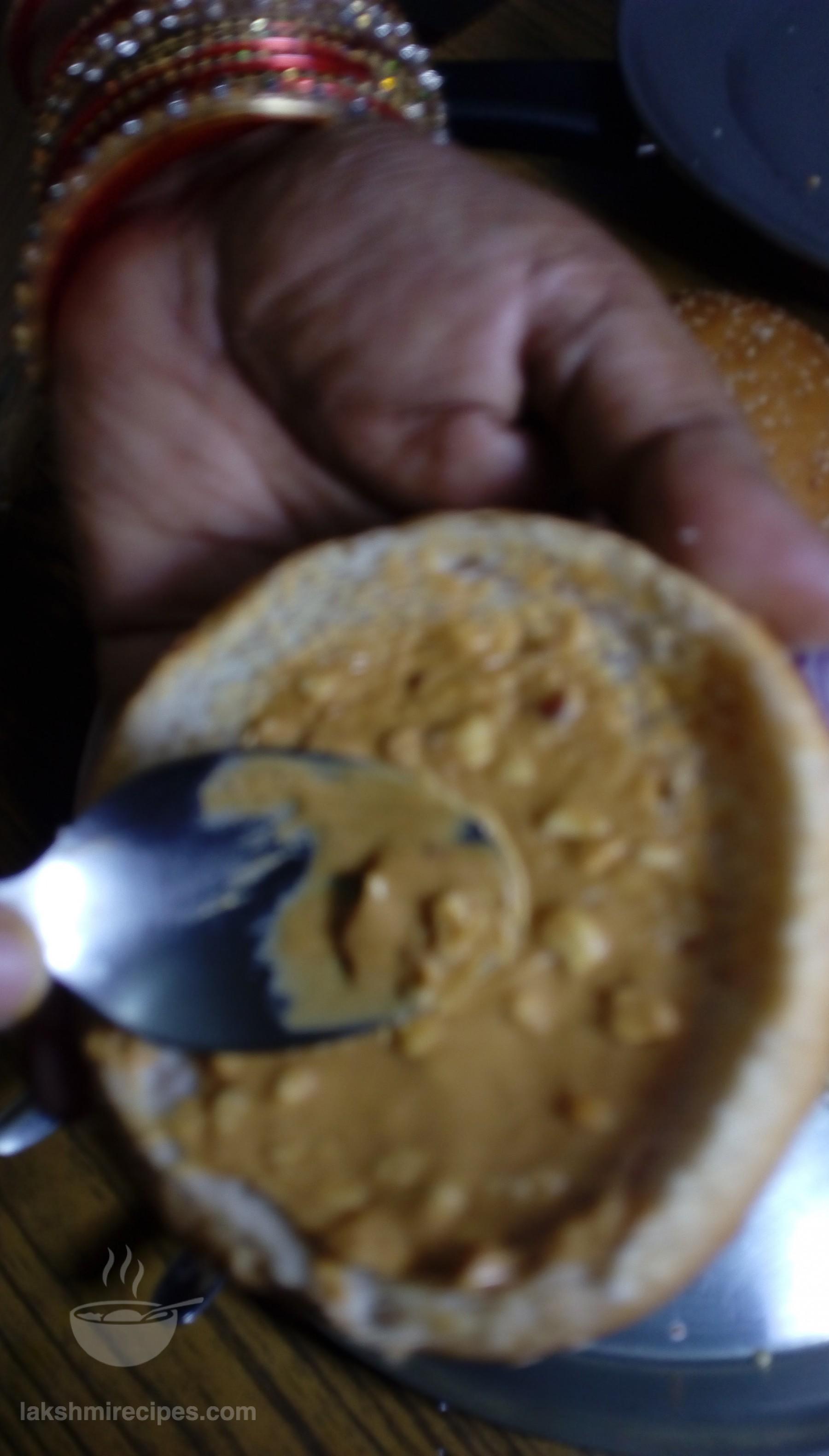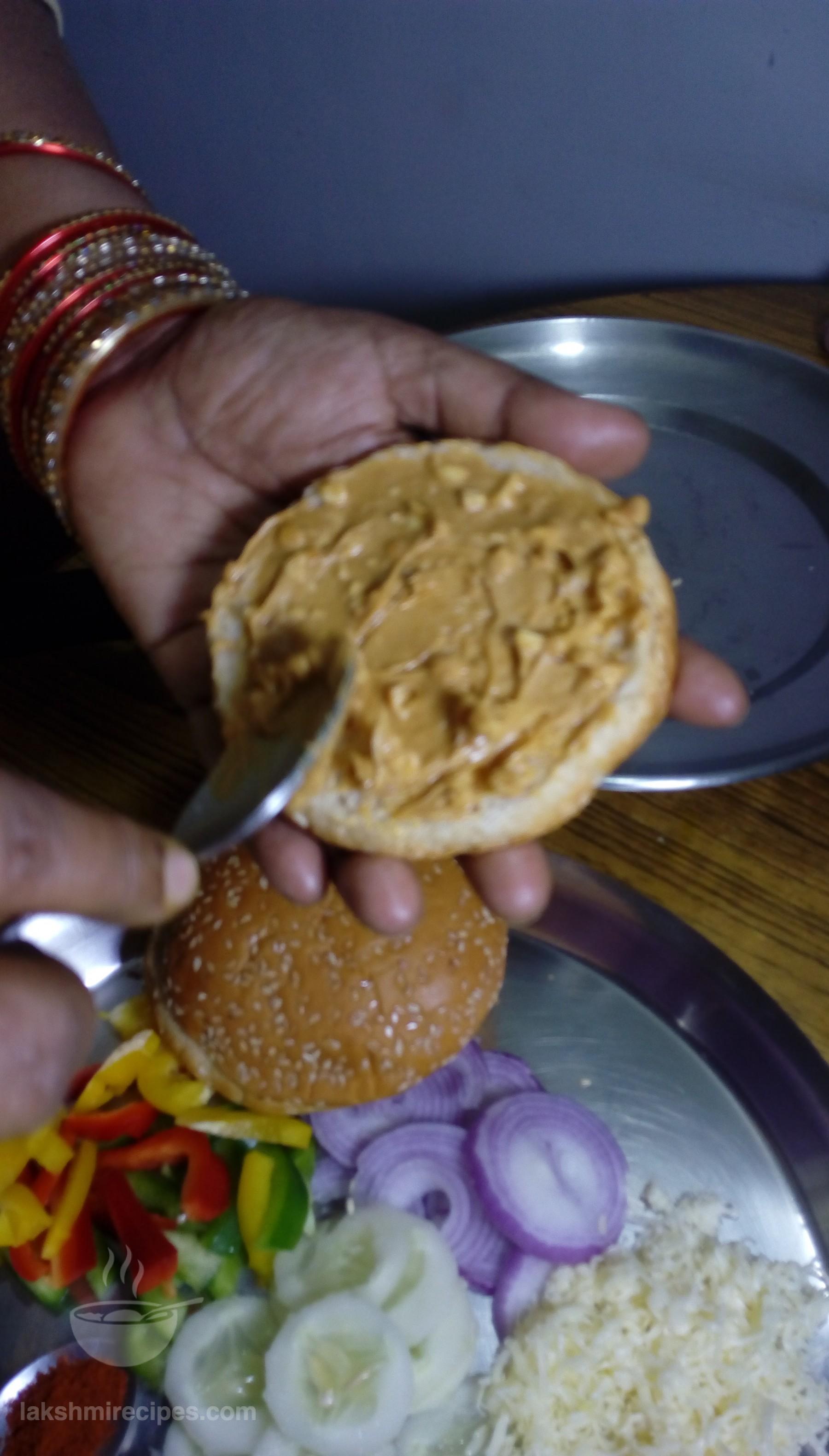 - Now spread some peanut butter on the toasted side of the lower half of the burger bun followed by a layer of tomato sauce.