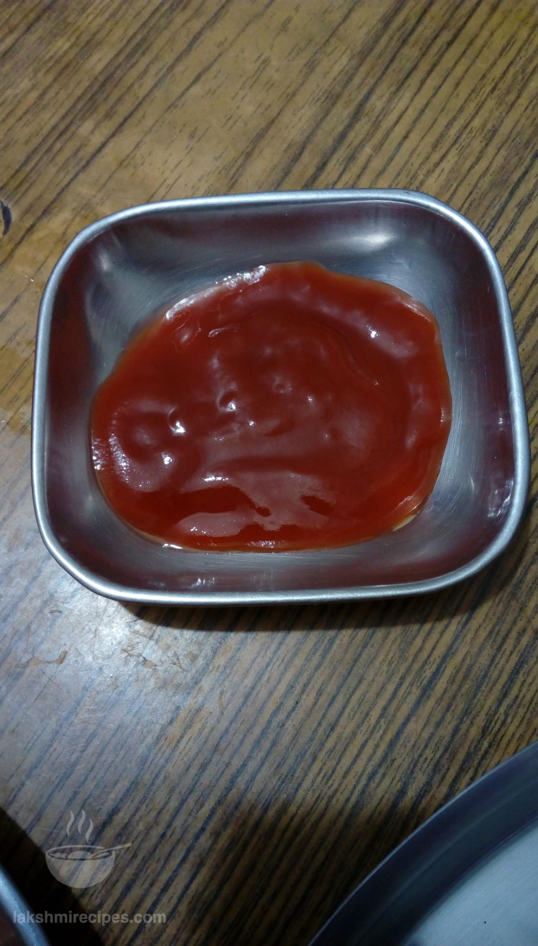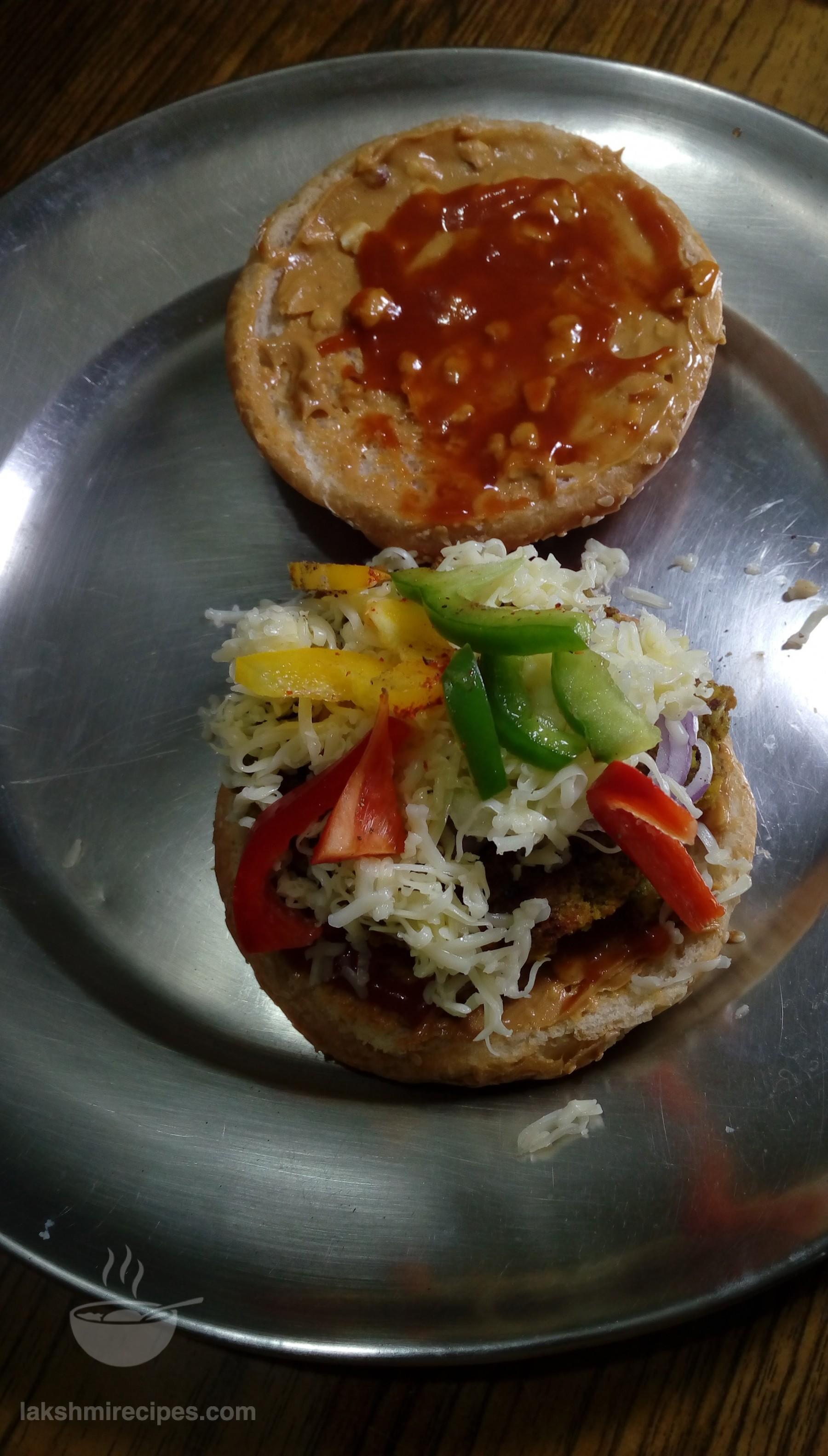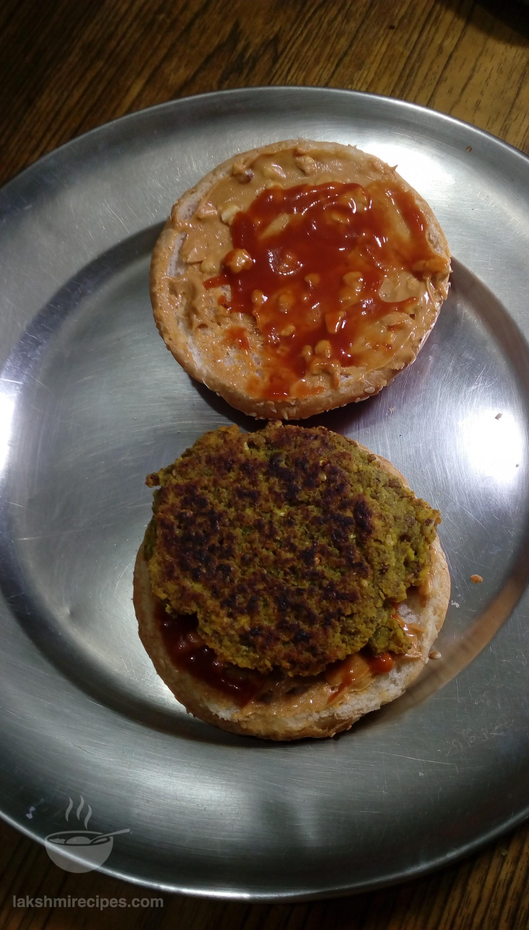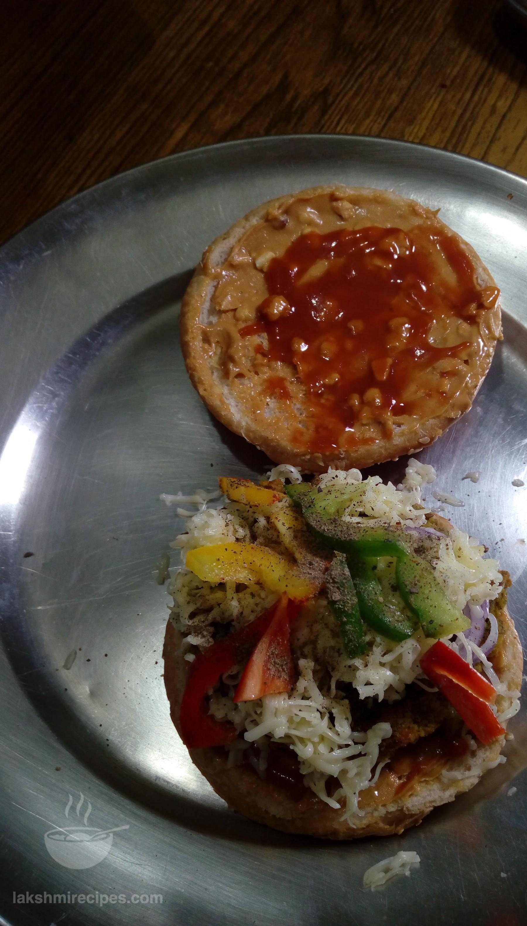 - Now spread some peanut butter on the toasted side of the lower half of the burger bun followed by a layer of tomato sauce.