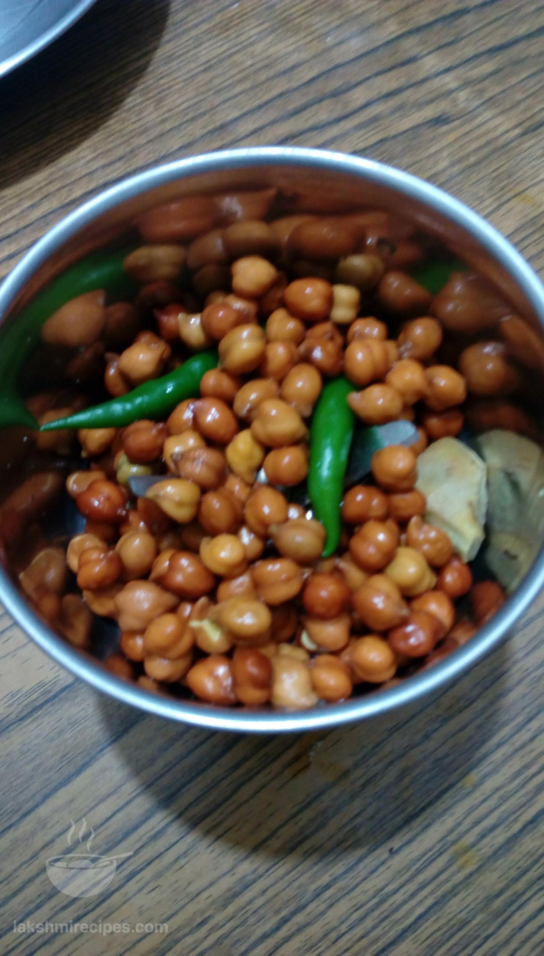 - Wash the soaked black chick peas (kala chana) and then transfer it to a mixer grinder jar. Add the green chilli (hari mirch), the garlic petals (lehsun ki kali) and ginger (adrak)to the mixer jar and then grind all ingredients together to slightly granular form. If the grinded mixture appears very dry then add 1-2 spoon water and grind slightly otherwise do not add water to grind the ingredients.