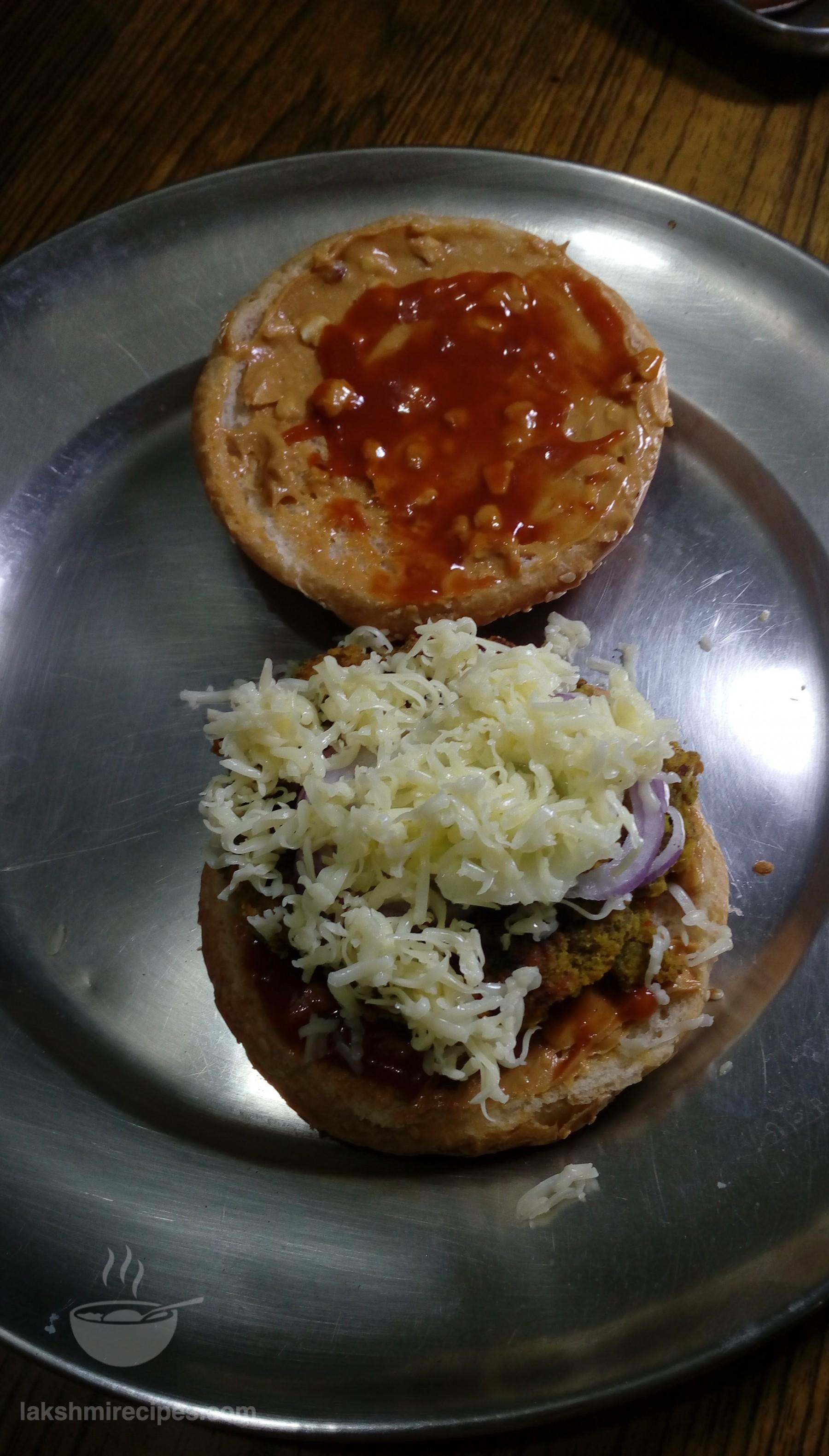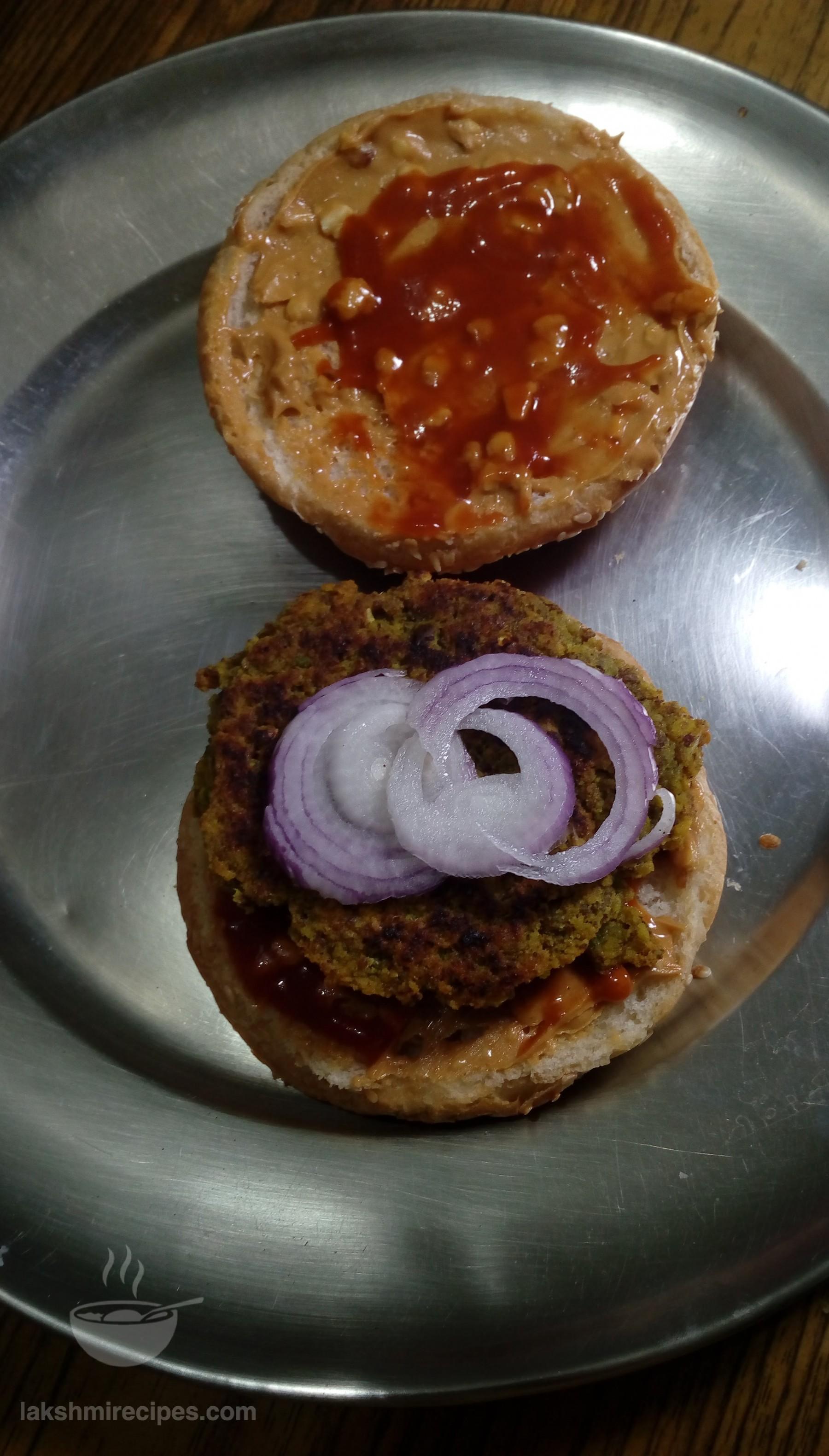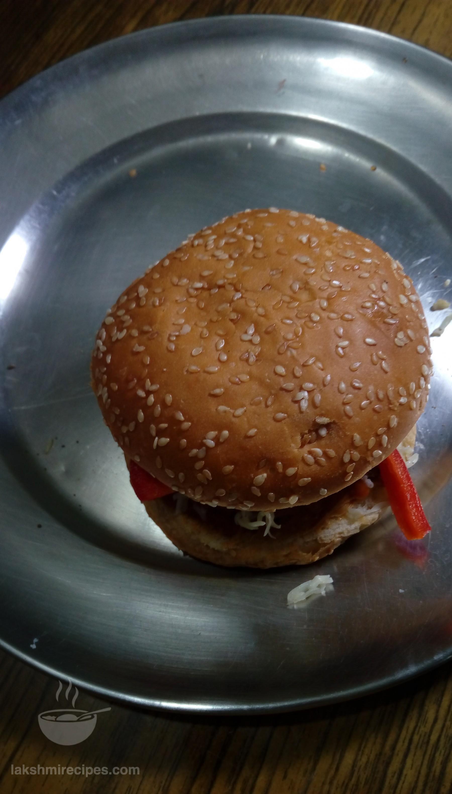 - Then put the upper half of the burger bun over it (as shown in the image below). Press the bun slightly and the falafel burger is ready to be served.