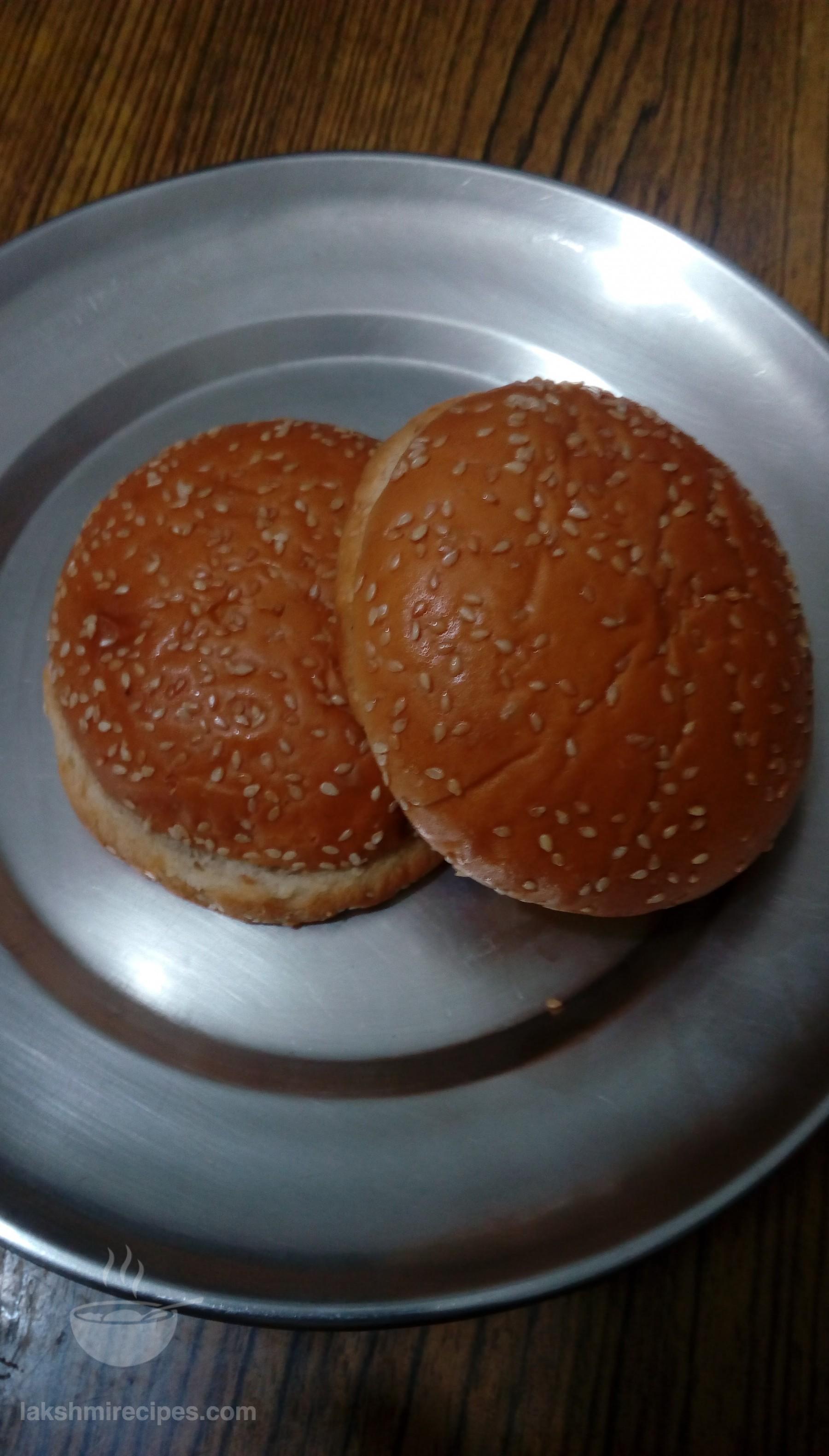 - Transfer the falafel patties (tikkis) prepared to a plate. Now cut the burger buns from the middle to divide then into upper and lower halves (as shown in the image below).