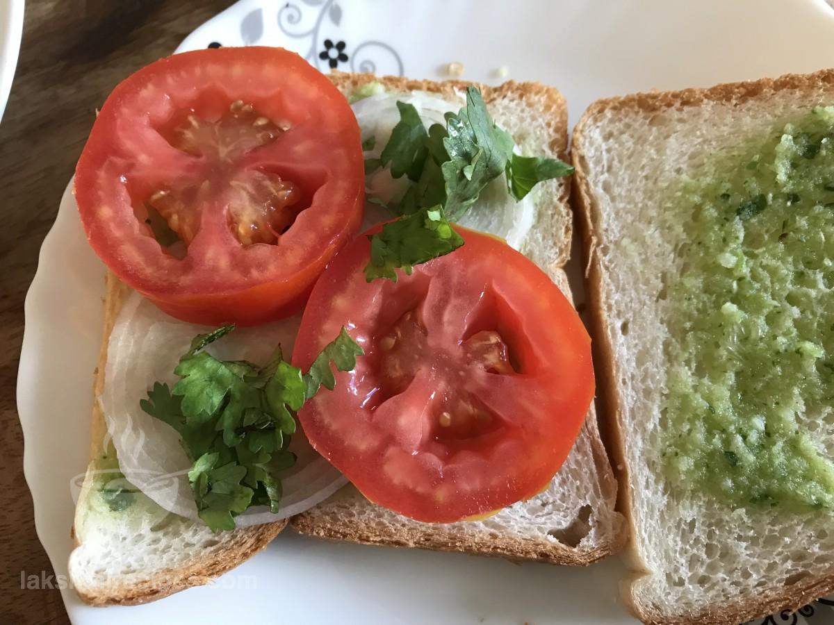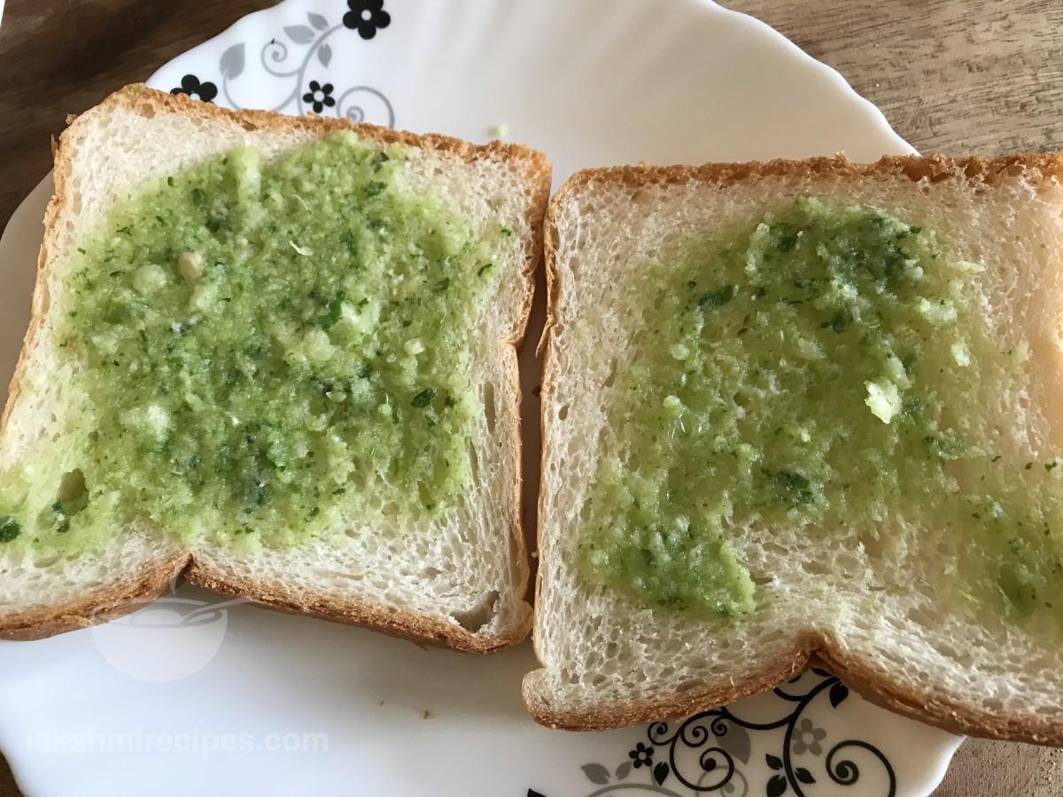 - Place 2 bread slices side by side in a plate. Spread green spicy chutney over one slice and tomato sauce on the other bread slice.