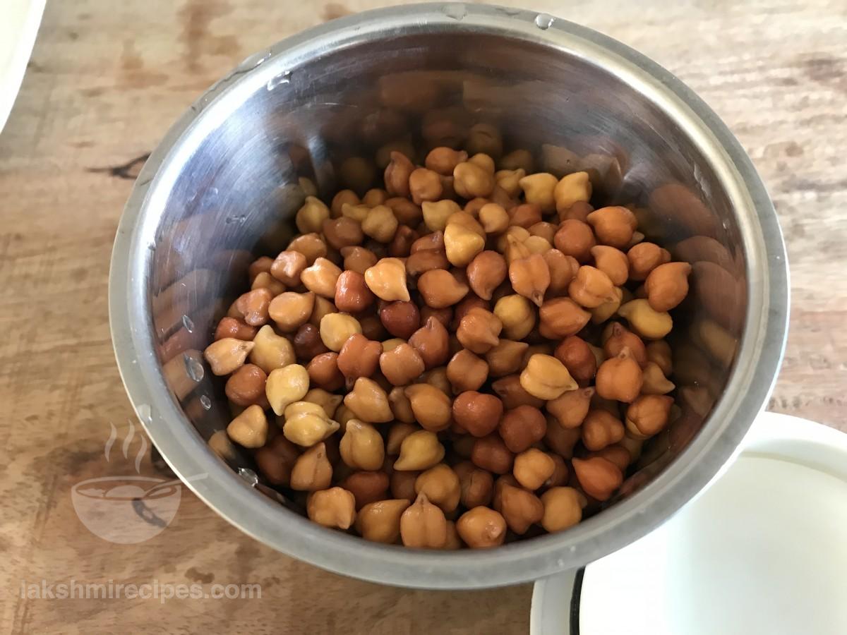 - Transfer the soaked black chickpeas to a mixer jar and add 1-2 table spoon water to it. Do not add more water while grinding.