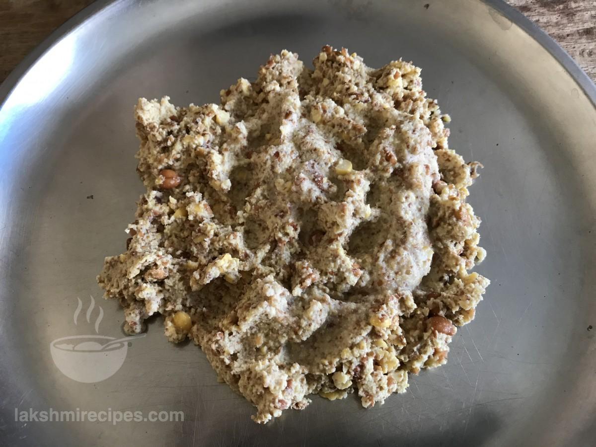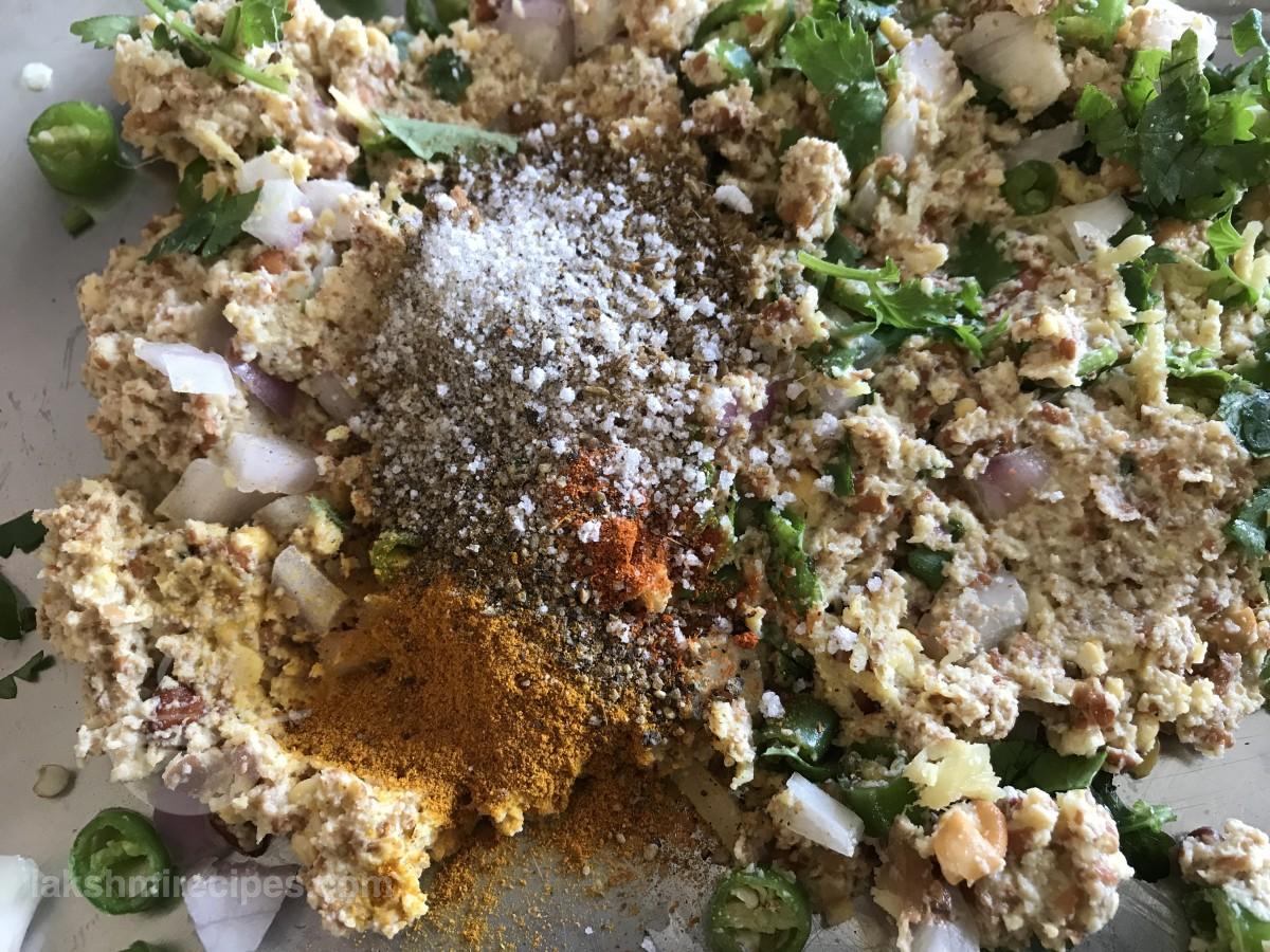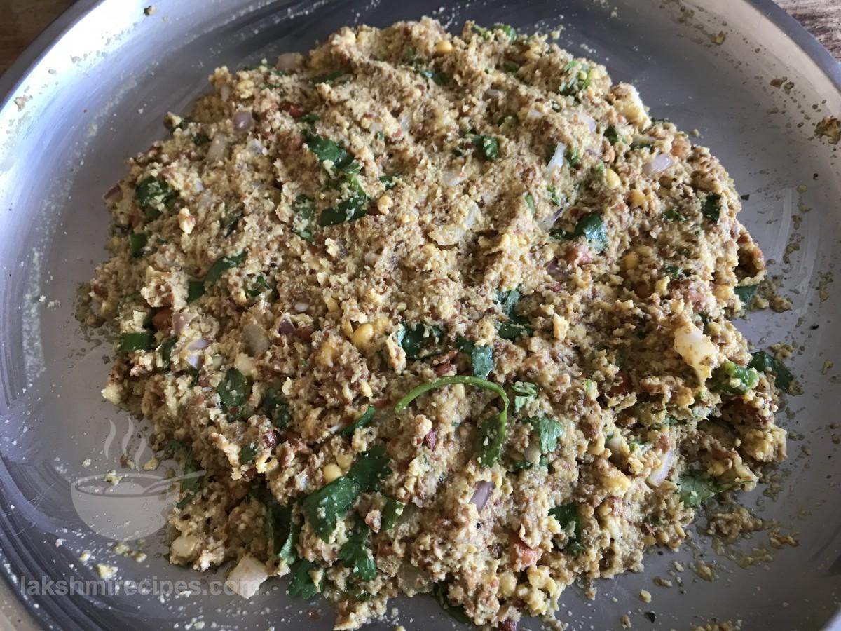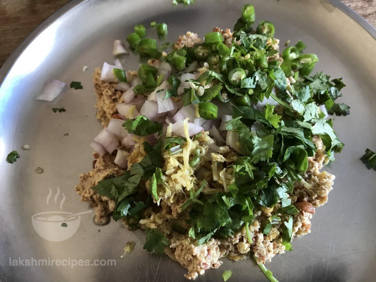 - Transfer the ground black chickpeas to a plate or a mixing bowl. Add chopped coriander leaves, green chilli, ginger and onion to it. Mix all the ingredients together.