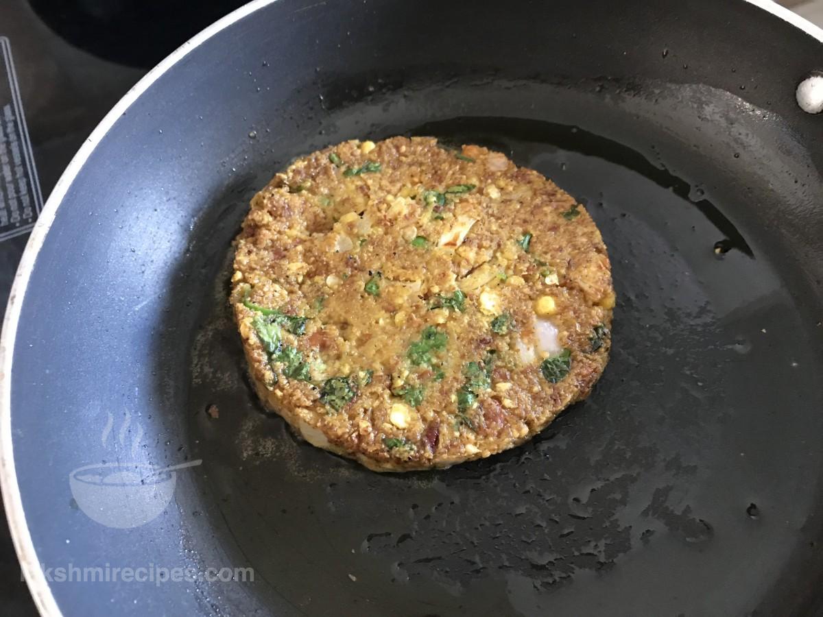 - Reduce the flame to low level to allow the cutlet to cook on one side. When it is cooked on one side then flip it carefully to cook on the other side. Add more oil (refined oil or mustard oil) as needed. Cook the cutlet of chickpea patty or chana cutlet or chana patty until it is crispy red on both sides.