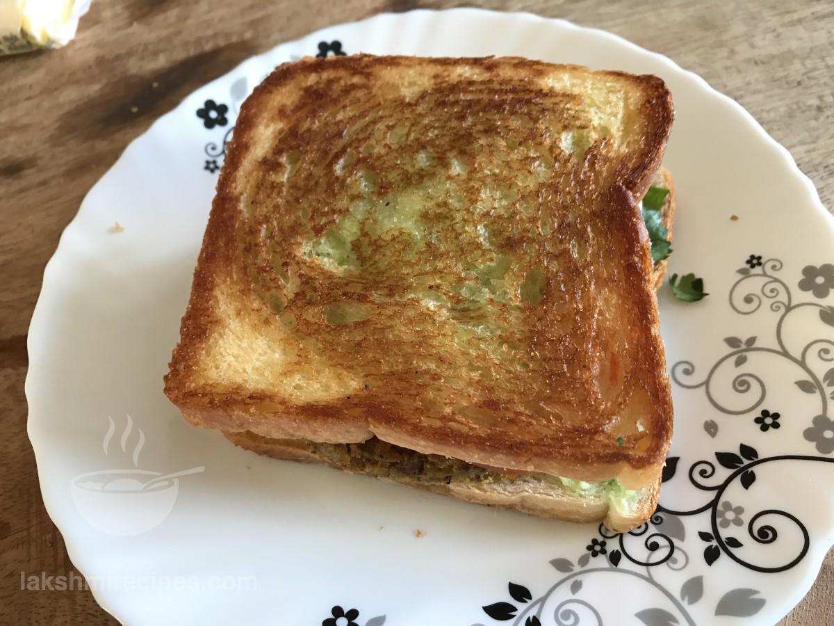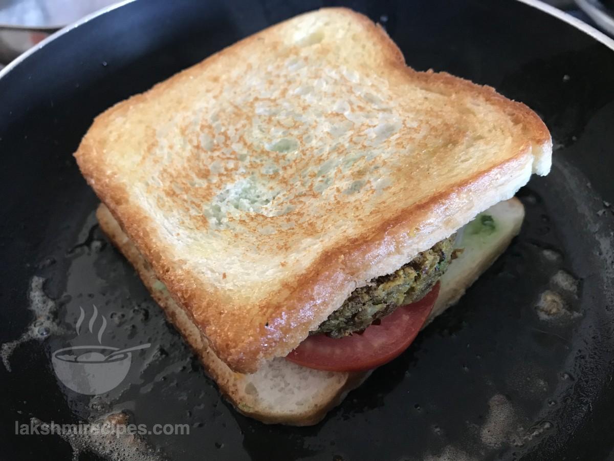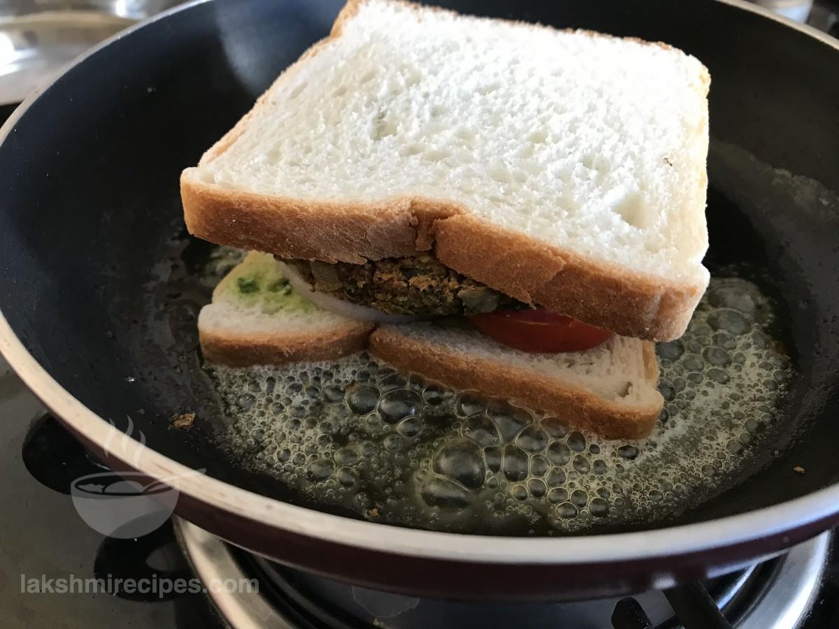 - Grease a hot tawa or non-stick pan with some butter and place the sandwich over it. Cook the sandich till one side turn crispy golden and then flip it to cook on the other side in the same way.