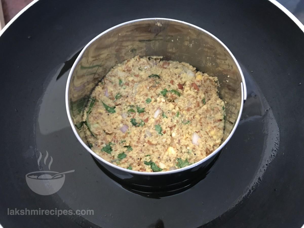 - Then place some onion rings, tomato slices, chopped coriander leaves and place on chickpea patty over it.