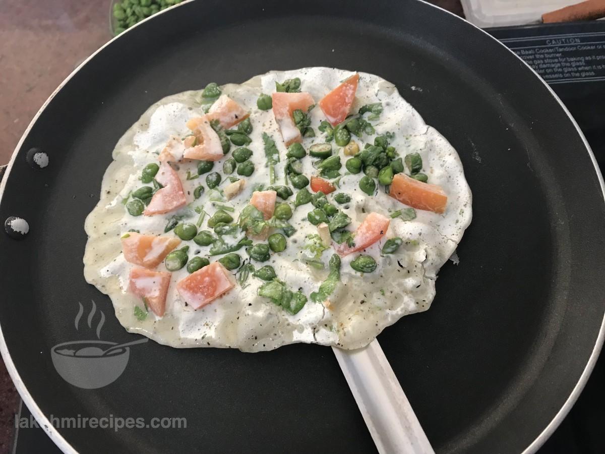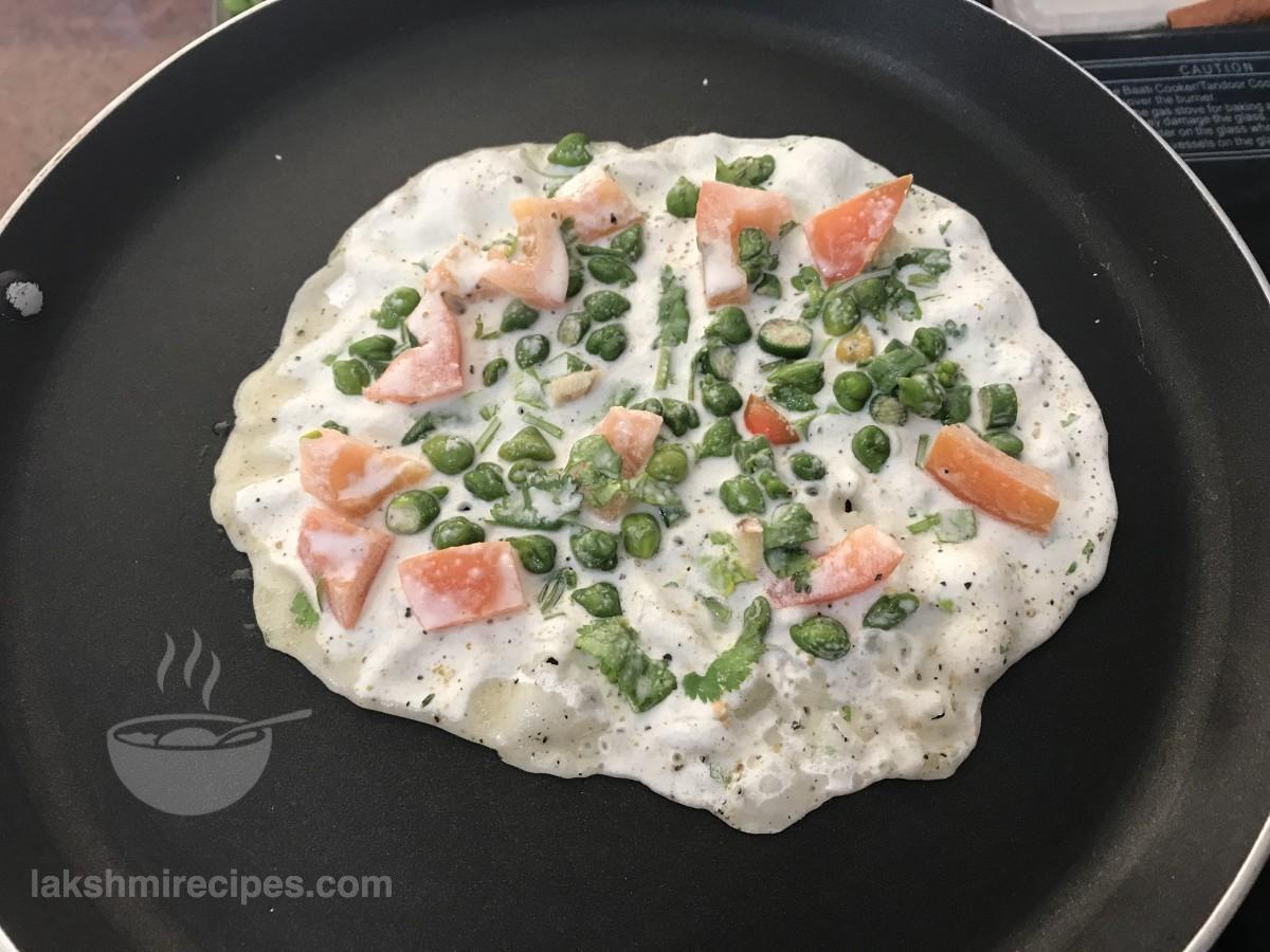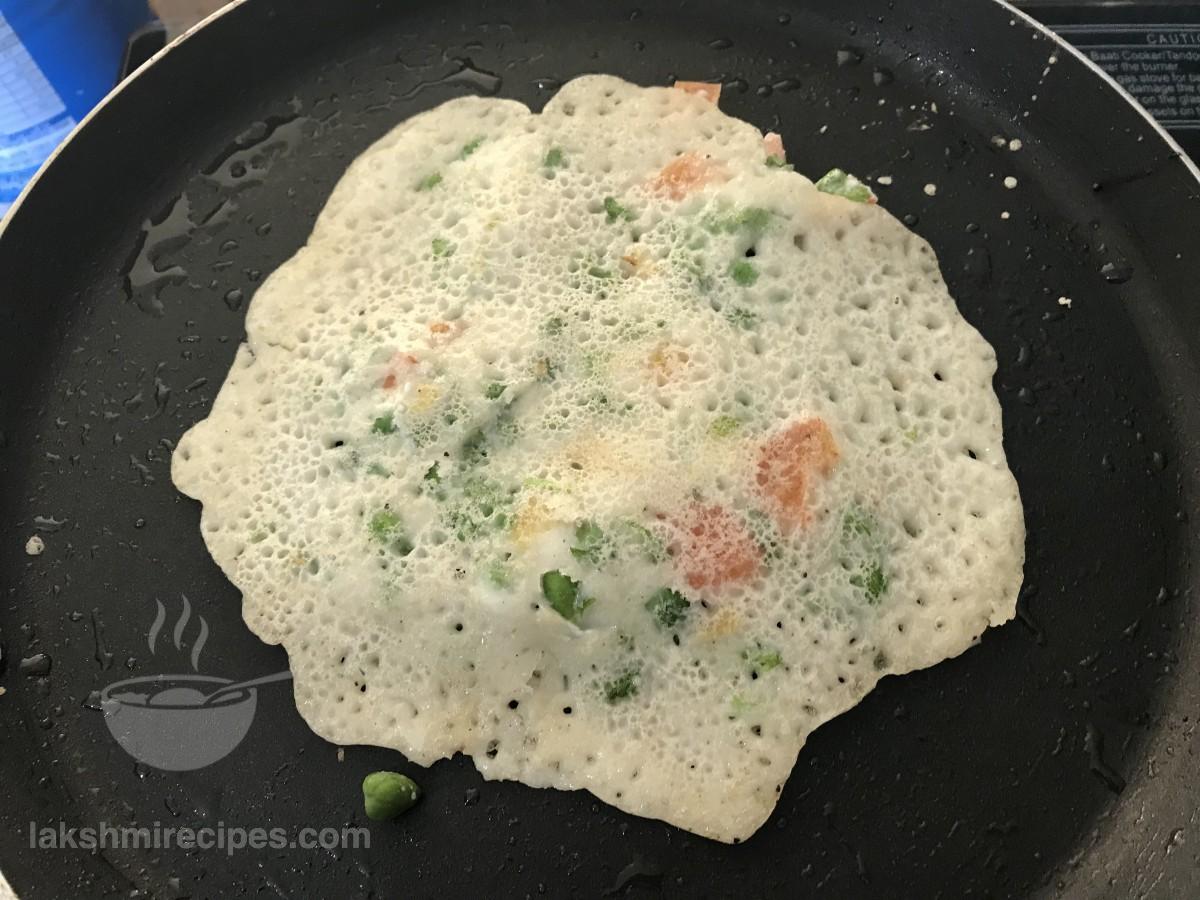 - आंच को मध्यम स्तर तक कम करें और हरे चना का चीला के घोल को धीरे-धीरे पकने दें।