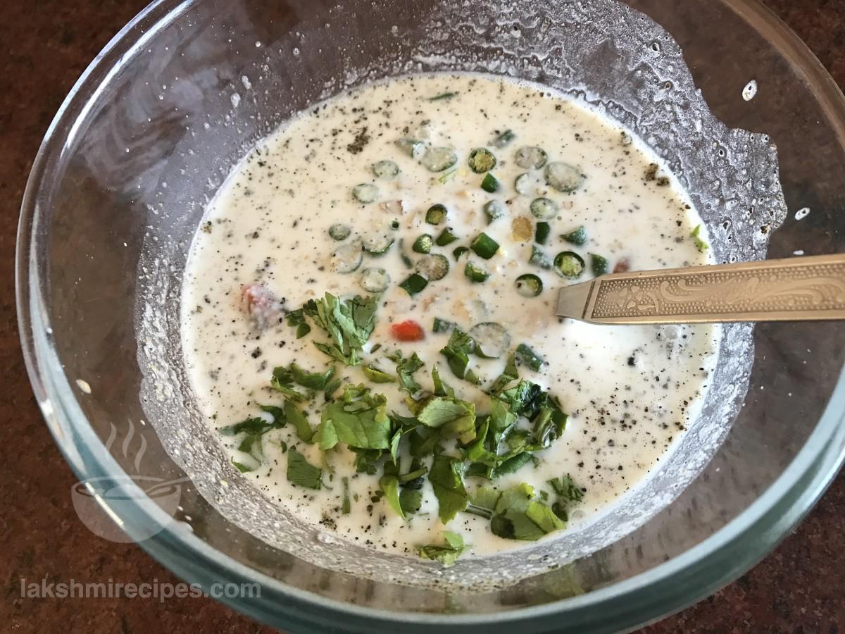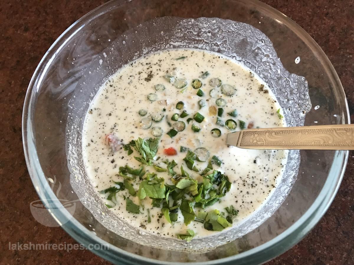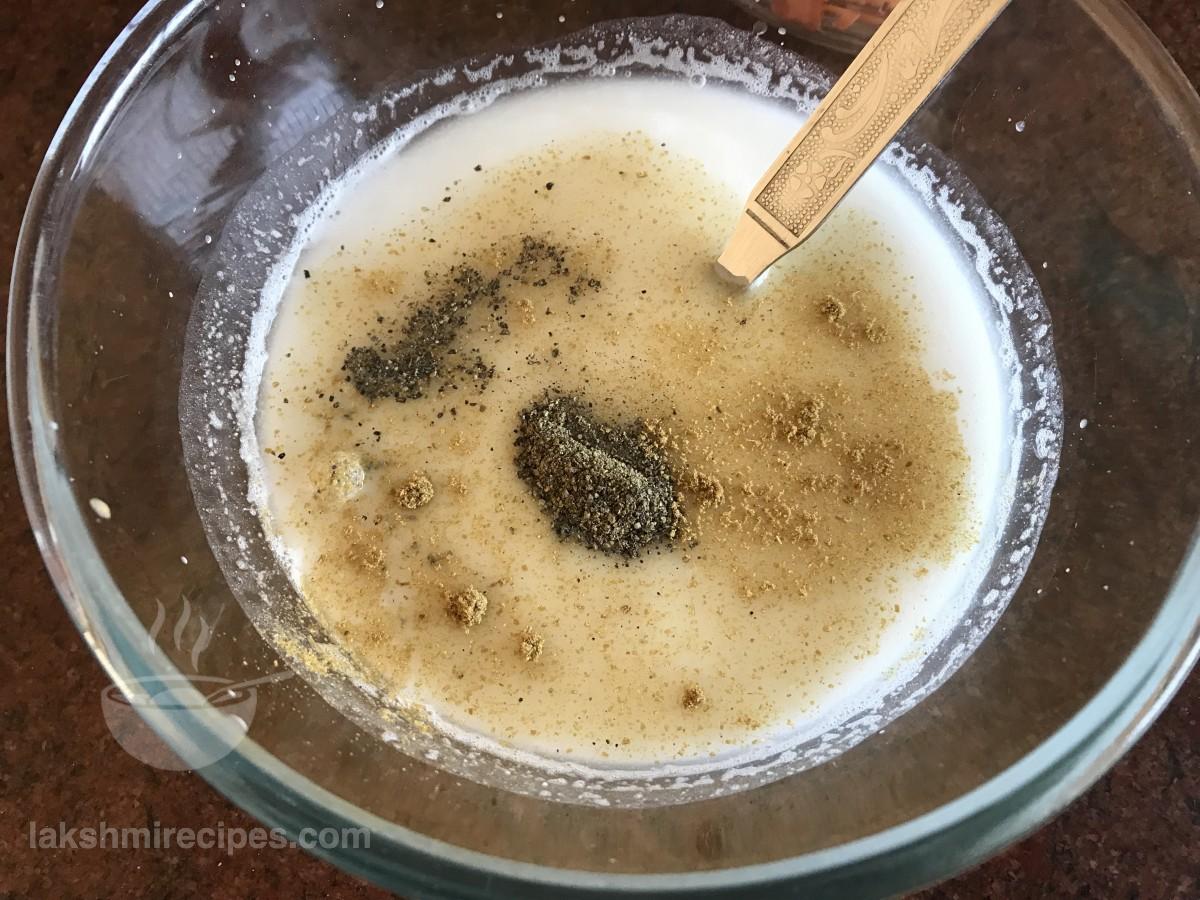 - अब घोल को नमक, जीरा पाउडर, काली मिर्च पाउडर, लाल मिर्च पाउडर और गरम मसाला पाउडर डालें। अच्छी तरह से सामग्री को मिलाएं।