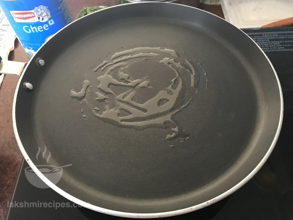 - Now heat a non-stick pan nicely and grease it with some refined oil. Stir the batter once with a round ladle. Then pour a ladle full batter onto the non-stick pan. The batter will flow and take a round shape like chilla on its own.